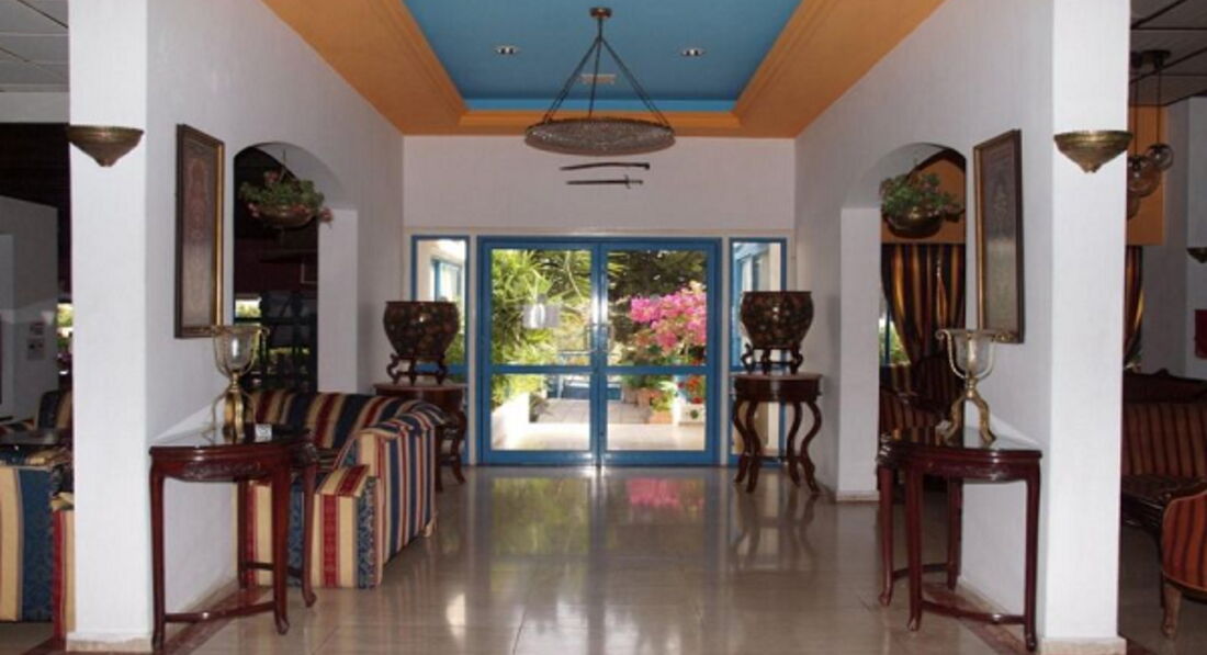 Когда трансфер развозил людей по первым отелям, конечно же при остановках стараешься их рассмотреть , заглянуть внутрь, арки красивые, скульптуры, когда же мы подьехали к нашему отелю у него даже входа не было, нас вывели и повели через дорогу !! Я чувствовала какой то позор , от взглядов туристов летевших с нами)) вход к нему пролегает оказывается через кафе , далее зал ожидания и стойка ресепшен. Потертые диваны, доисторический телевизор, кругом одни англоязычные пенсики, ( нам кто то из отдыхающих рассказал ,что им выдают бесплатные путевки для лечения здесь, что то типо пансионата) . Моему разочарованию не было придела, и что я весь отпуск проторчу здесь ?! Вообщем заходя вперед хочу сказать, что не все так страшно, как показалось изначально. Прошлась по периметру , территории своей нет, кафе закрытое и открытое, бассейн , рядом бассейн для детей , немка лежит с оголенной грудью, и тут же где стоят лежаки тоже номера оказывается есть, то есть выходишь из номера и через 3 шага можно нырять))) слава богу нам этот номер не достался. Посели нас на 2 этаже, 114 номер, да туда ездит лифт, ресепшн считается на 0 . Сразу при заселении беда, телефоны сели , надо бежать магазин через дорогу и срочно покупать переходник. Бутылок питьевой воды нет! Сейф за деньги! Холодильника нет! Слава богу кондиционер есть .в коридоре встретили рашен туристов они нам тоже рассказали свою версию, что в номерах красные муравьи , убираются плохо, и скучно . Мы сразу взяли все замечания на вооружение: оставляли на весь день кондиционер включенным - и о чудо ни одного муравья не выжило! В первый день оставляли на чай - и каждый день получали отличную уборку! Ну а в отеле вообщем то тусить не собирались , кроме завтраков , кстати нормальные такие завтраки, хоть и одно и то же каждый день- шведский стол, каша, сок,чай, круассаны,яица, фасоль, молоко, хлопья, кофе, можно по несколько раз подходить брать все что хочешь. Я в первый день посмотрела как англичанин делает тосты, поливает их соусом, далее сыр, ветчина ( вкусная) , фасоль !!! И мммм. Пальчики оближешь! Кстати воду на баре можно брать бесплатно с лимончиком )