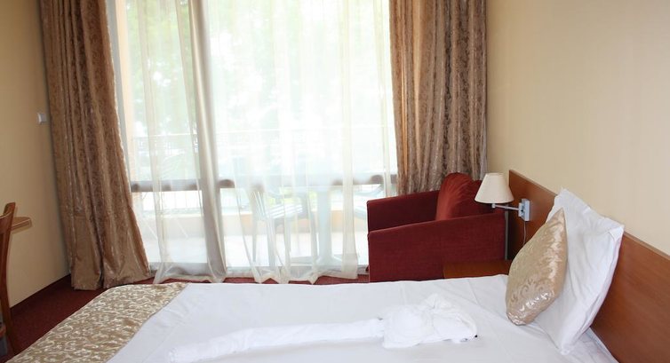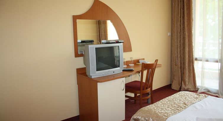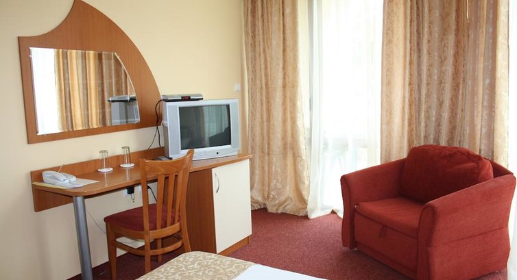 Отель не понравился. Жить можно, но получить удовольствие трудно. В номерах, особенно на нижних этажах, шумно из-за бара и ресторана под окнами. Вас это не затронет, если вы и сами любите погулять до двух часов ночи. А с маленькими детьми с плохим сном там делать нечего. Оборудован отель бедненько. Мебель из дешёвых материалов, ржавенькая полусломанная сушилка для белья, телевизор старого образца не жидко-кристаллический экран, портящий ребёнку глаза. Холодильник не работал на охлаждение и полки в нём порушены, продукты было не сохранить. В другом номере, куда мы переехали, спасаясь от шума, холодильник был нормальный. На полу зачем-то постелен ковролин! С протоптанными грязными дорожками и разводами. Мой ребёнок пролил на него горшок с "большим" и "малым". И я лишний раз подивилась нецелесообразности такого покрытия в общественном жилье. К тому же нам его, кажется, и не пылесосили. Выезжали из "пыльной песочницы". А перед сном от пыли у меня стал отекать нос, что бывает со мной только в очень захламлённых старьём квартирах. Из матраса проступают пружины, длины простыни не хватает на кровать, она задирается. Одеяло вываливается из пододеяльника. Дополнительных одеял в номере не было. Электрическое освещение номера тускловатое. Для дневного сна ребёнка затемнение не создать, нет ни жалюзи, ни второго ряда штор. На балконе мебель тоже обшарпанная. Это мелочь, но таких досадных мелочей набиралось уже многовато... Совмещённый сан. узел с душем нормальный.