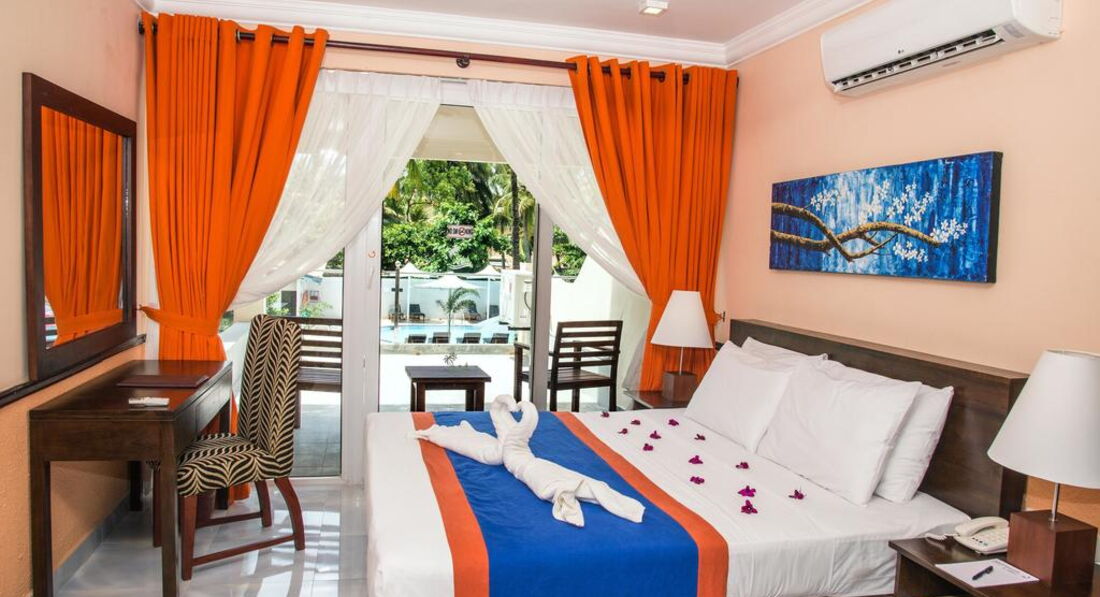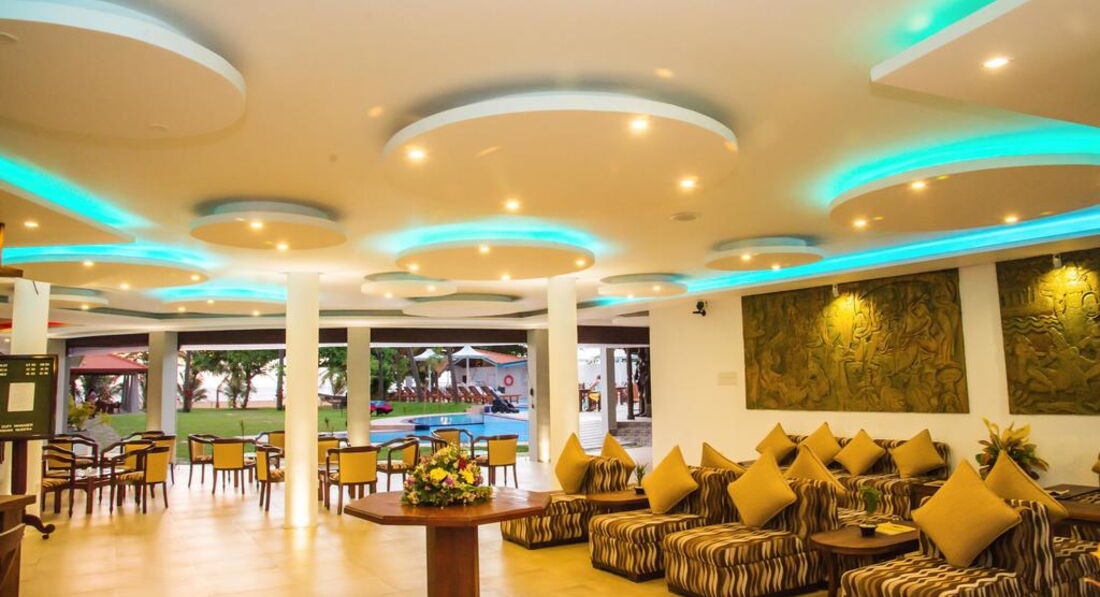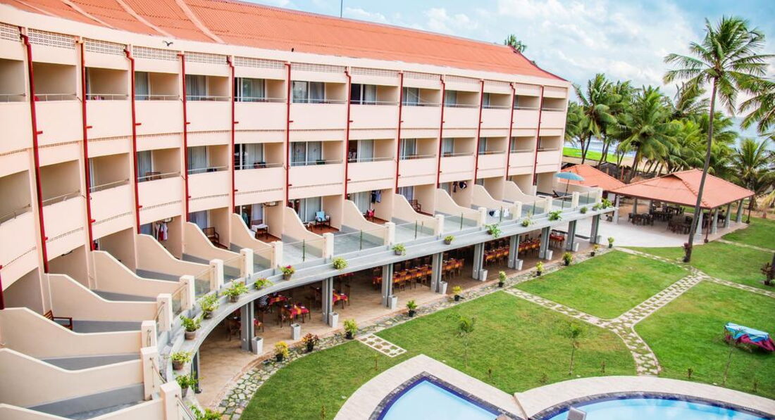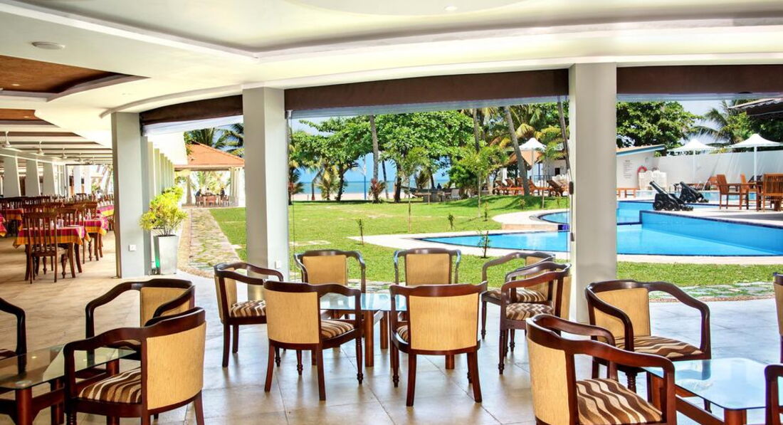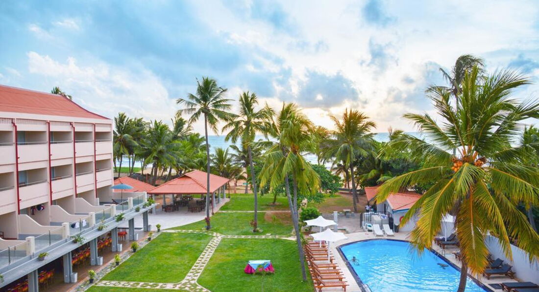 Отдыхали в этом отеле с подругой. Из плюсов: рядом с аэропортом (трансфер занимает минут 20-30). Находится в ГОРОДЕ! То есть в пешей доступности есть рестораны, супермаркеты, сувенирные лавки. Напротив отеля есть супермаркет, где всегда можно купить воду, соки и всякую мелочевку ( солнцезащитный крем и др) Из Негомбо удобно ездить в Коломбо и на экскурсии по стране. Небольшая, но очень зеленая территория, плавно переходящая в шикарный песчаный пляж ярко-оранжевого цвета. Шезлонги стоят в тени пальм на зеленой травке, которую постоянно подстригают и поливают. На территории всегда находится специально обученный человек, который поставит шезлонг в нужное место, постелит матрасик и полотенце. Бассейн небольшой, но очень чистый и уютный )) Есть 2 детские секции. Рядом с бассейном бар, где можно перекусить, выпить пива, кофе, чай. Официанты ходят и по территории и принесут все вам прямо к шезлонгу. Вообще обслуживание неплохое....официанты и весь остальной персонал всегда улыбаются. Завтраки немного однообразны, но голодным точно не останешься. Всегда есть ананасы, папайя, арбузы, бананы. все это порезано на кусочки. Есть круасаны, пончики, кексики. Сосиски, карри (очень острое) и всякие блюда местной кухни. Если вас ничего не впечатлило, всегда можно заказать омлет с разными добавками. Овощей нет практически. Пляж! Это самое замечательное в Шри Ланке! Пляжи в Негомбо широченные и абсолютно пустые! На пляжах не разрешается ставить шезлонги, поэтому все лежат на территории отелей, а ходят к океану только поплавать. Вид пляжа поэтому потрясающий..особенно после 17.00, когда солнце садится прямо в океан. В это время все выходят на пляж и наблюдают за закатом сидя на мягком песочке. Океан шикарный! Почти постоянно волны, на которых так здорово качаться ))) В Негомбо есть торговые центры, в которых довольно неплохой шопинг. Все из натуральных тканей и в пределах 200-300 российских рублей. До центра нужно ехать на тук-туке - 150-200 рупий, как договоритесь )) Это около 1$. Рекомендую ресторанчик "Шерри Лэнд", очень вкусно и недорого. Из отеля налево и метров 800-900 пройти мимо магазинчиков и лавочек. Недалеко от него есть чайная лавка. Большой выбор чая, практически по тем же ценам, как и на плантации. Из минусов отеля-староват номерной фонд...сантехника, мебель-все очень простое и скромное. По приезду мы были немного шокированы видом номера, но потом привыкли и все компенсирует вид с балкона. Кстати, в этом отеле все номера с видом на территорию и океан! Но селиться лучше повыше-2-й, 3- этаж. Тогда вид будет лучше.В общем отель замечательный, нам отдых очень понравился. Будут вопросы-пишите, с удовольствием отвечу.