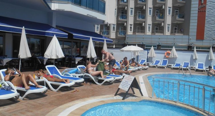 Пляж через дорогу. Есть светофор!!! Только все равно смотрите по сторонам, т.к. мопеды не всегда стоят на красный. Так вот про пляж. У отеля своего бесплатного пляжа нет. Ближайший №9. Лежак стоит 4лиры, зонт тоже 4 лиры, по мне так очень удобно, не хочешь зонт, не платишь лишнего (видела попытки торговаться, но тут похоже торг не уместен. Работник пляжа сам подходит за деньгами и может сделать это далеко не сразу как вы заняли лежаки). Но места там много, песочек чистый, можно и бесплатно (как и на любом пляже Турции) на полотенце полежать. Есть душ, переодевалка и WF. Туалет тоже есть, ключ нужно брать у пляжного работника, тут вот не знаю нужно ли за него платить, если не брал лежак. По ценам на остальных пляжах не смогу дать инфо. Удобство данного пляжа в том, что он прямо у отеля и плиты, которые есть на всех пляжах Алании, тут довольно далеко друг от друга, т.е .места на вход в море много. До буйков метров 200 )). После обеда приносит мусор, но он только у берега и не в таком количестве, как на пляжах ближе к центру. При наличии волн также плавают кусочки водорослей.