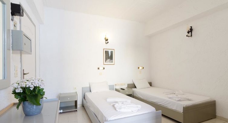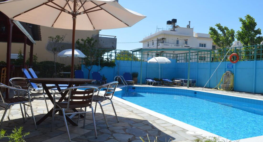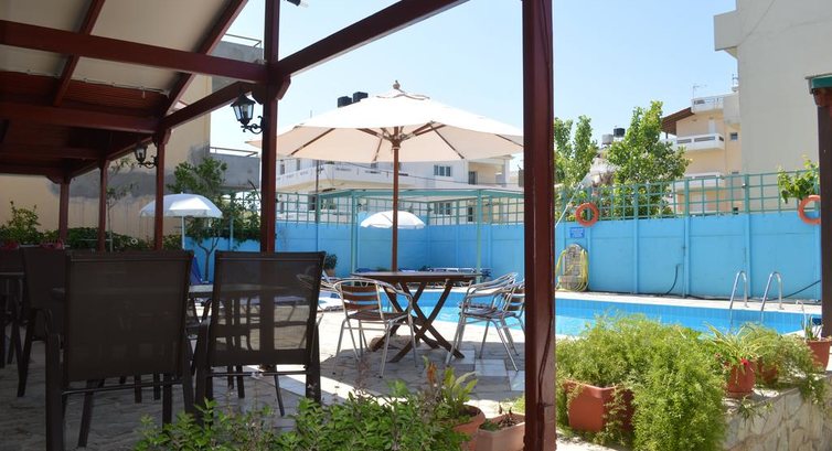 Територія та послуги: • основний ресторан (критська кухня, сніданок «шведський стіл») • снек-бар (легкі закуски та напої) • сад на території • wi-fi на території • автопарковка • камера зберігання • оренда автомобілів Розваги та спорт: • відкритий басейн • фітнес центр • екскурсійне бюро Для дітей: • ліжечко в номері (за запитом) • стільці в ресторані (за запитом) Живлення: • RO – без живлення. • BB – сніданок. Пляж: Громадський піщаний пляж за 250 м від готелю. Парасольки, шезлонги – платно. Пляжні рушники – не надаються. До оплати приймаються кредитні картки: Visa, MasterCard, AmEx, Maestro.