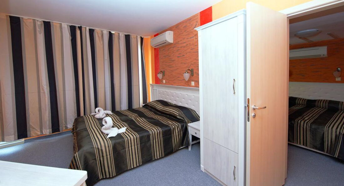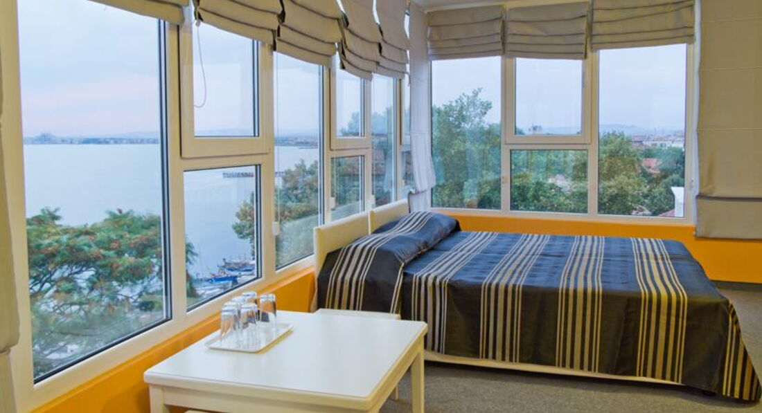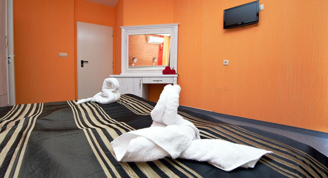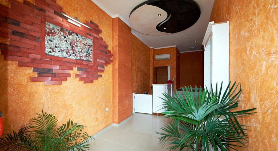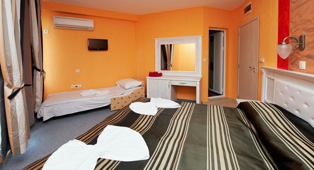 Отель семейный, 3* - действительно 3*, иногда четверки встречаются хуже. Отель расположен с старом городе Помория. Прямо на набережной, через небольшую дорогу. Минус в том, что большие автобусы-трансферы не могут к нему подъехать, т.к.припаркованные машины мешают. Так что если есть возможность, договариваться надо о мини-трансферах. Иначе придется идти пешком минут пять с чемоданами. Под окнами есть кафешки, в одном до двух ночи гуляют и поют местные песни. Если закрыть окна, то ничего не слышно. Рядом есть магазинчики. До центра 5 минут ползком, с детьми. Там парк с кучей разных машинок (5лев)-каталок-батутов (4лева)-4D-ватой-поп-корном. Короче, все для развлечений детей и подростков. У навс были дети - 5,7,12,15,18 лет - и всем было интересно. Пешеходная зона с кучей кафешек и магазинов. До такси идти те же 5 минут. Такси в Бургас - около 30лев. До автобусной станции - минут 10 пешком (цена билета в Бургас 3лева, в новый город Помория 1лев). Банкомат и банк находятся в 3 минут хотьбы. В пятницу банк закрывается в 16.30, в суб-воск не работает. Банкомат работает 24часа. Везде принимают только левы. Очень редко евро. В некоторых магазинах и ресторанах можно расплатиться картой. Поэтому наличные лучше всегда иметь при себе. И никогда не берите 100лев одной купюрой! Местные ее в глаза не видели, поэтому очень сложно будет ее поменять. Самый большой и единственный минус отеля - отсутствие пляжа. Напротив отеля - причал катеров, яхт, лодок и прогулочных кораблей. Вид - шикарный, но...пляжа нет. Кто-то умудряется лежать на большой каменной плите и загорать. Там есть ступеньки в воду. Если идти влево от отеля, то можно пристроиться на небольшой полосочке пляжа Отеля Поморие. Но и он не впечатляет - галька, куча людей друг у друга на головах. Одним словом, мы ходили еще дальше, минут 10-15 налево от нашего отеля, на городской пляж. Песок, зонты(6лев), спасатели (что актуально, когда красный флаг и волны выше человеческого роста). Также куча кафешек, блины-мороженое-кукуруза. Иногда там к берегу прибиваются водоросли (надо просто перейти через пирс). Есть пляжный волейбол. Еще мы ездили на другие стороны Помория - везде разные пляжи, цвет песка, волны где-то есть, где-то всегда тихо.Насчет самого отеля - 5 этажей. Лифт до 4-го. Номера - один люкс (в нем жила подруга с детьми) и много других разномастных номеров. Из каждого номера - вид на море. А он просто незабываемый! В номере кондиционер (не выключается, когда уходишь), телевизор, шкаф (небольшой), кровати удобные, тумбочки, большое зеркало, стол. В санузле - нет поддона у душа, вода сливается в слив в середине помещения. Сначало это раздражало, потом привыкли. Фена нет. Дали только мыло и туалетную бумагу. Полотенца меняли по мере загрязнения, без проблем. Белье три раза за 11 дней. Сам номер нормальный, нам втроем было где развернуться. Балкон большой, сушка есть, столик, кресла и табуретка. Очень дружелюбный персонал - начиная с ресепшн и заканчивая уборщицами (чаевые 1-2 лева). Мы просыпались поздно, гуляли допоздна. Никогда не было никаких проблем. На завтраки почти не ходили - особо не вкусно - помидоры-огурцы,хлопья,молоко,колбаса 1вид, сыр 1вид, иногда яйца. Кофе-чай - пить невозможно. Мы все купили сами и ели в номере (маленький чайник привезли с собой, чашки купили, тарелки и ложки брали в ресторане). Насчет обеда и ужина - не знаю. Мы ели в кафешках - на трои