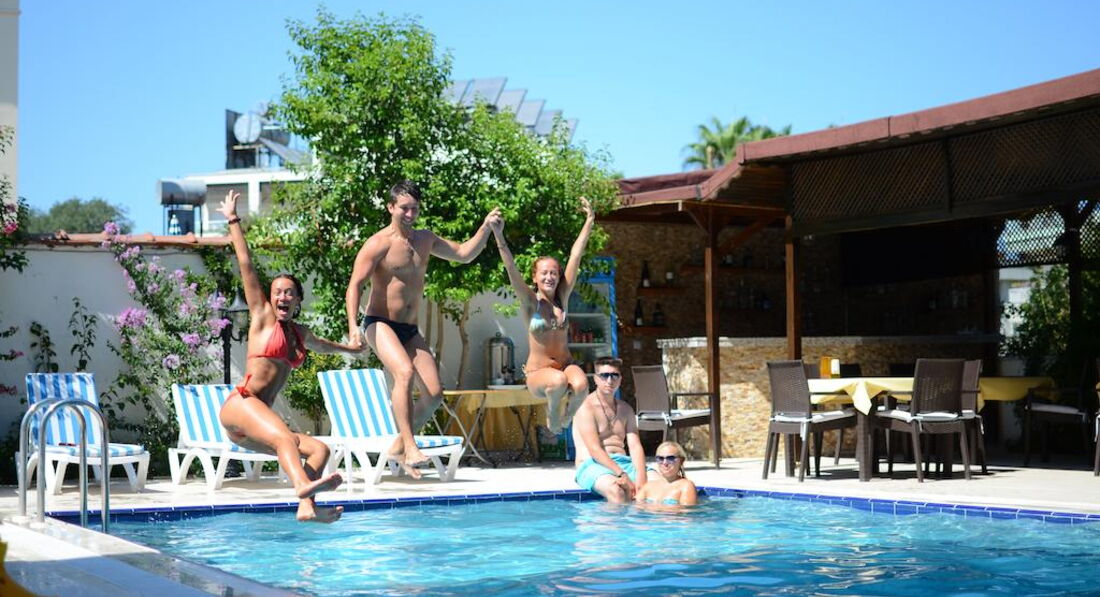Совершенно тихий, спокойный отель в шикарном месте! Завтраки весьма условны:)) Яйца, которых нет через 15 мин после начала, невкусная колбаса( как везде в Турции), обычный сыр и вкусная брынза, огурцы, помидоры и 2 вида вкусного варенья. Чай как бы должен быть весь день, но не всегда; нужно просто пойти и попросить.. На мой вкус, так лучше в приличный отель без еды , чем наоборот!:) одно здание, маленький бассейн. Номера симпатичные, персонал улыбчивый ( только на английском ).. Возьмите кипятильник, пригодится:). Всем отличного отдыха!
