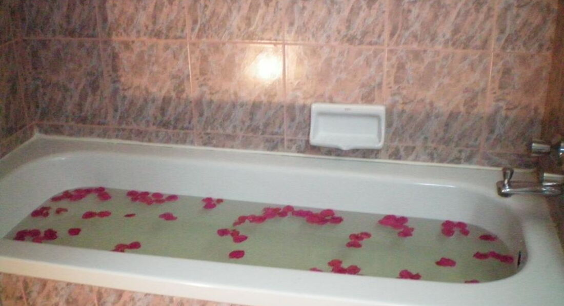 •ванна кімната з ванною або душовою кабіною, феном і туалетним приладдям.