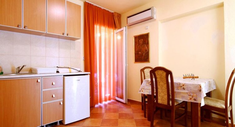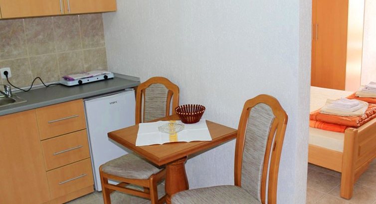 STUDIO: однокімнатний номер, французьке або роздільне ліжко, шафа, тумбочки, телевізор, кондиціонер, кухня, необхідний посуд, балкон. Санвузол: туалет та душ.