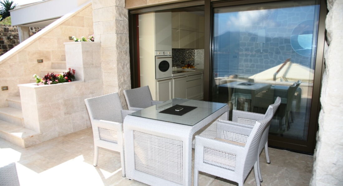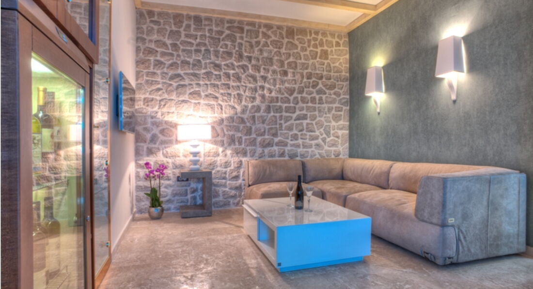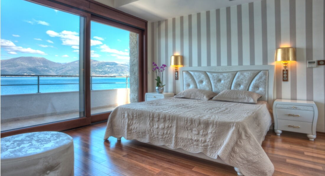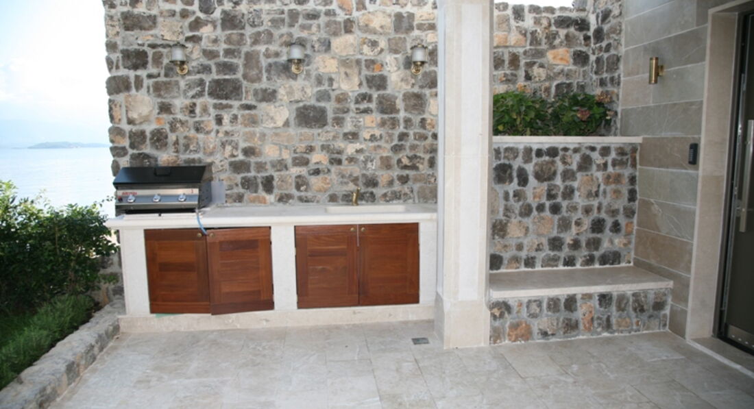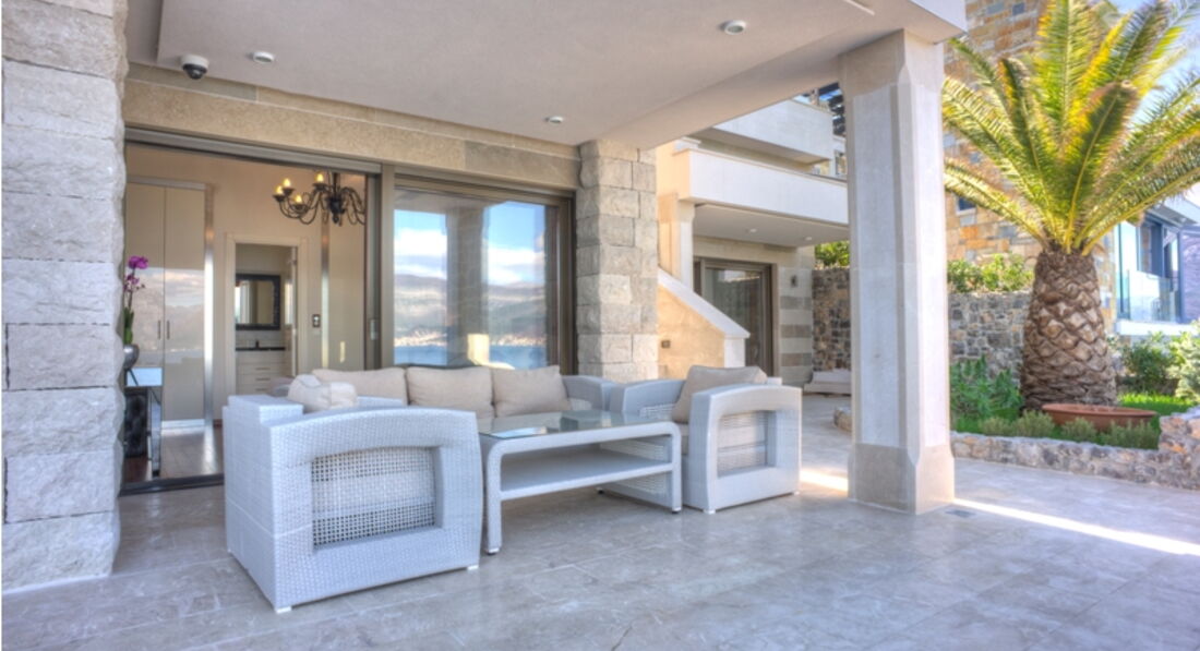 Перший поверх: Вітальня з каміном, зона для відпочинку та їдальня виходять на велику криту терасу, сучасна повністю укомплектована кухня, окрема вітальня з винною вітриною, спальня з французьким ліжком, ванною кімнатою та видом на море. Також є ще одна окрема спальня з французьким ліжком, ванною кімнатою, кухнею, видом на море.