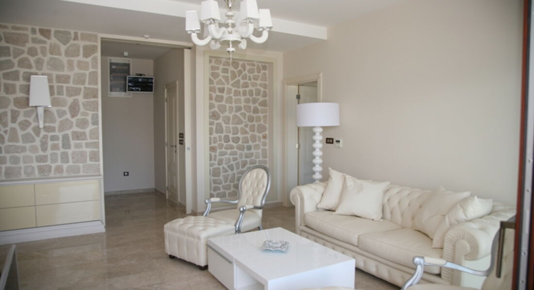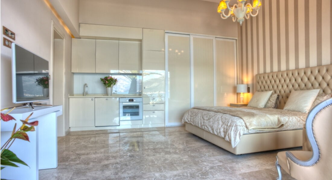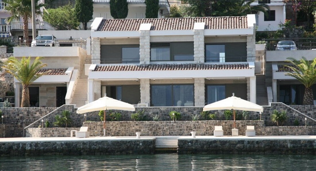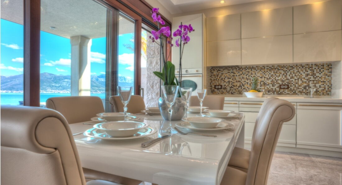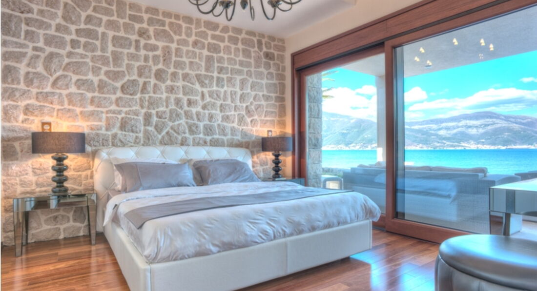 Перший поверх: Вітальня з каміном, зона для відпочинку та їдальня виходять на велику криту терасу, сучасна повністю укомплектована кухня, окрема вітальня з винною вітриною, спальня з французьким ліжком, ванною кімнатою та видом на море. Також є ще одна окрема спальня з французьким ліжком, ванною кімнатою, кухнею, видом на море.