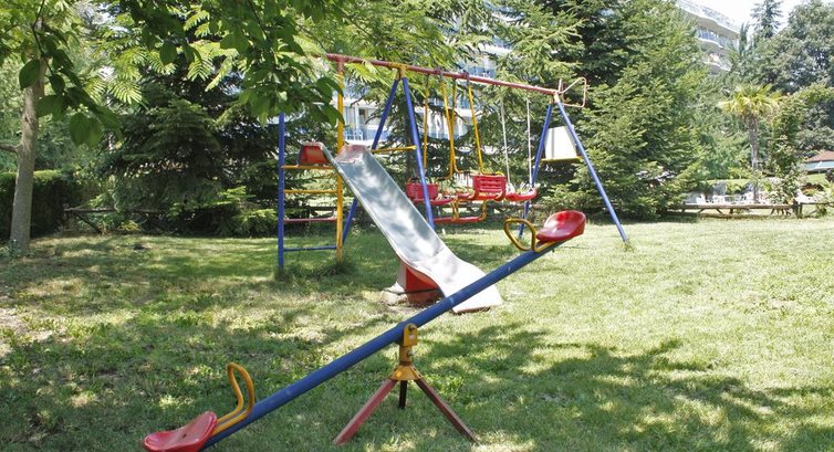На территории есть детская площадка ( но она очень старая и я бы сказала "травмоопасная"). Так что осторожнее.