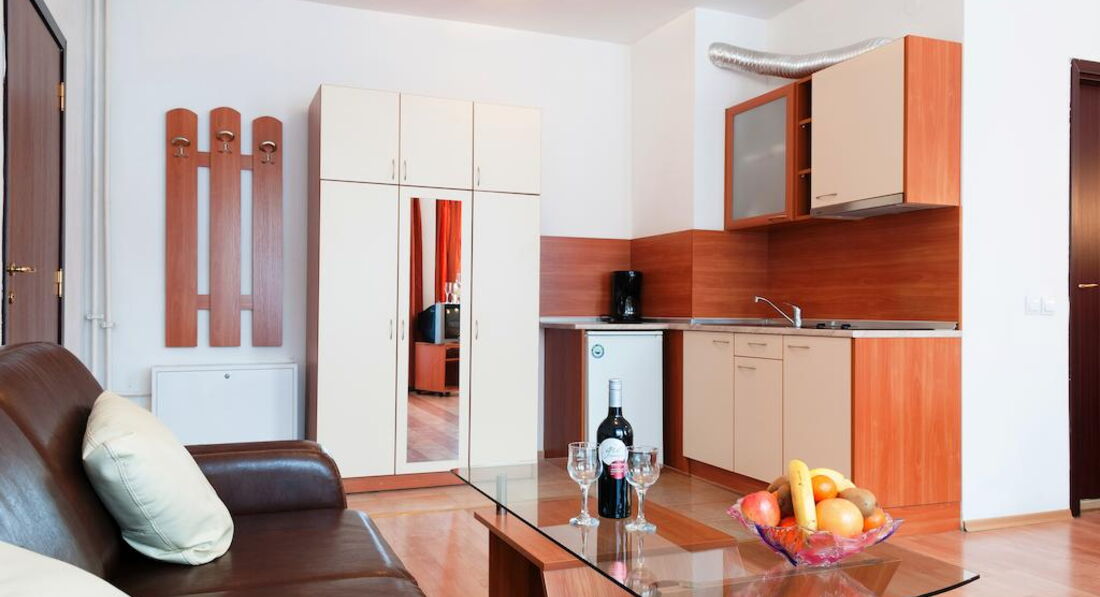 Типи номерів: studio apartment 1 bedroomУ номері: балкон опалення кухня / кухонний блок ванна санвузол рушники TV: канали інтернет фен холодильник письмовий стіл