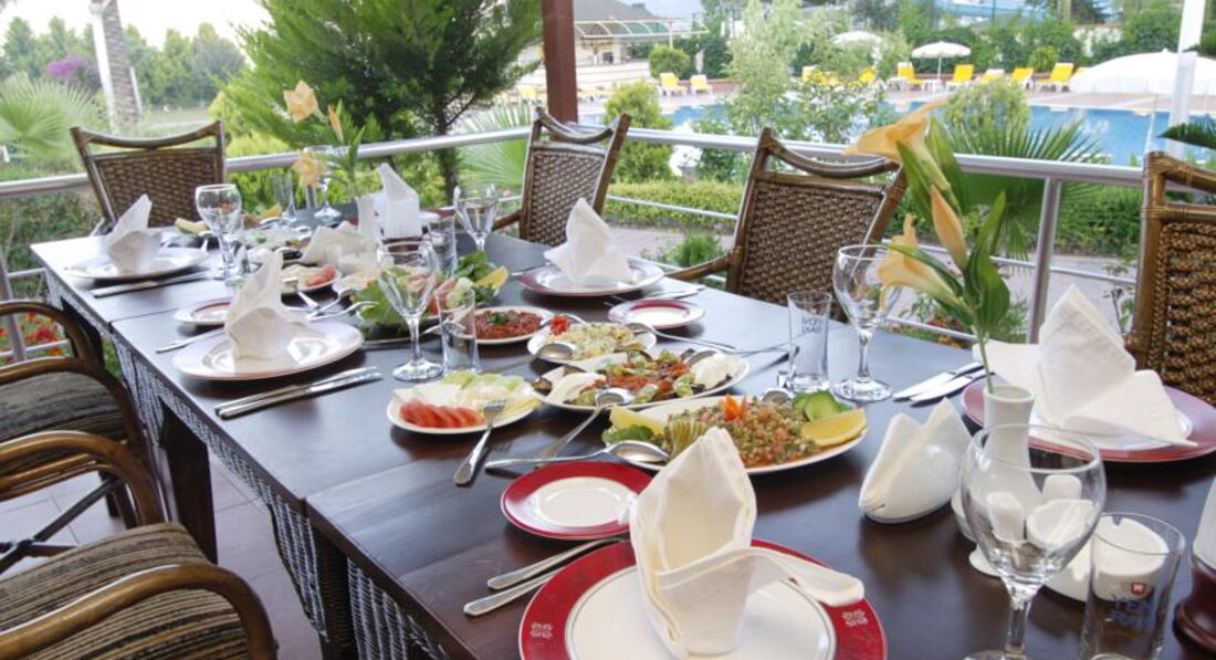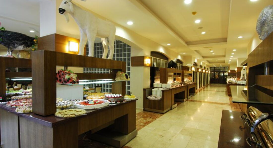 Питание как и во всей Турции, омлеты, яичницы, яйца, овощи пареные, вареные, свежи и соленые. Оладьи, йогурты, фрукты: яблоки, апельсины, грейпфрут и т.д. сыры, колбасы разных видов( соевые)) выпечка тортики, булочки лепешки, курица, говядина гуляш, котлеты. По вечерам барбекю возле бассейна курица, разная рыба, мясо баранина... С 4 до 5 давали мороженное разных вкусов мягкое в рожках. Алкоголь- пиво, джин, водка, раки, вино бел. и красн. сухое. Сухое. Кофе, чай, соки в автоматах и многое другое, а еще видела диетическое меню вареная курица, картофель, каши...