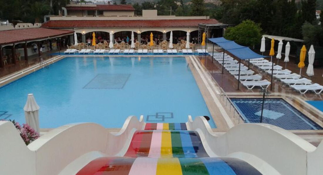 Бассейн чистый,ухоженный.Возле бассейна всегда хватало лежаков,везде матрасики.Горку включали один-два раза в день на часочек где-то.Неплохая детская площадка.Анимация для детей никакая,каждый день и вечер одно и тоже.Длявзрослых тоже:дартц,водное поло и зарядка.