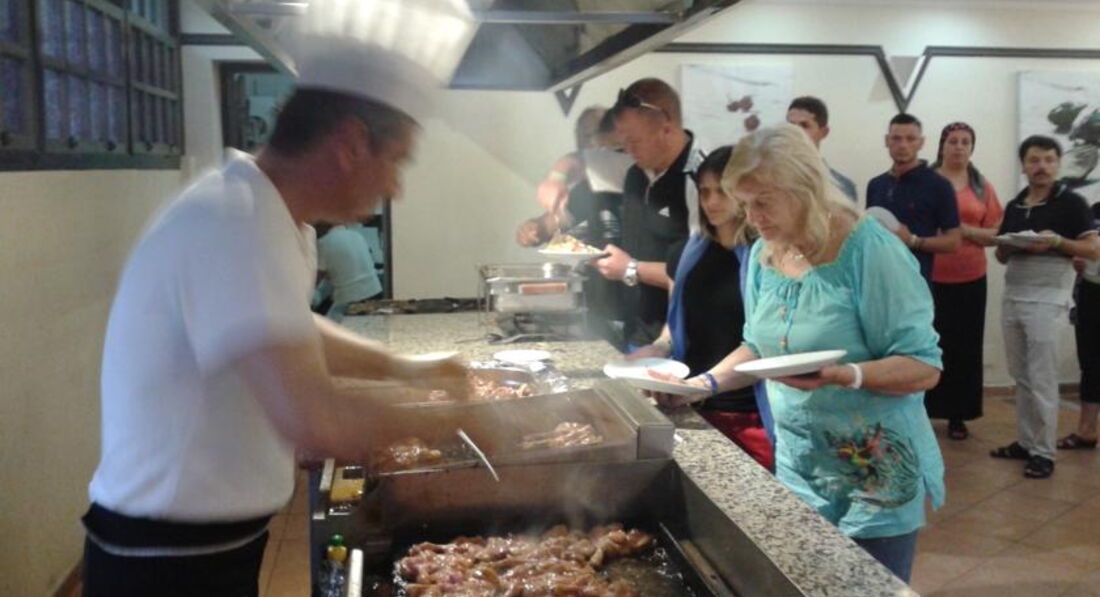 Питание отеля очень достойное. Не забываем, что отель позиционирует себя как 3*. Нет бесполезного ассортимента, когда много всего, но толку нет. Блюд не так много, но они самодостаточны, они не повторяют друг друга. Всё съедобно и самое главное - вкусно. Завтрак: запеченные томаты, палочки из картофеля, сосиски, глазунья, яйцо отварное, трубочки с творогом, оладья (но эти блюда не все сразу в один день); овощи, сыры, оливки, хлопья, молоко, джемы, тарталетки; арбузы, дыни, апельсины, грейпфруты (фрукты на завтрак всегда порезаны); чай (заварной), кофе и разные напитки на кофейной основе, соки типа юпи. Обед: рыбные палочки, рис, изделия из фарша, курица, спагетти, тушенные овощи; салатов становится в разы больше, чем на завтрак, выпечка и целые фрукты: яблоки, сливы, нектарины; резанные на кусочки фрукты: арбузы, дыни, апельсины. Алкогольные напитки и чай/кофе. Кстати, все напитки в пластиковых одноразовых стаканчиках! Не понимаю, почему администрация не может закупить посуду и использовать ее многократно. Только представьте, сколько пластика используется ежедневно! Ужин: на улице готовят на огне либо рыбу, либо котлетки, либо курицу (что-то одно из перечисленного) и питу (лепешки с начинкой) и плюс всё то, что было на обед. Конечно же, блюда меняются и что-то добавляют новое. Обслуживание в ресторане на высоте: грязные тарелки убирают мгновенно, если что-то кончается из еды, то тут же приносят, все пополняется сразу же, не бывает так, что придя чуть позже, чего-то не застанешь. Еще должна сказать, что салаты сервируются в небольшие салатники, что очень удобно - на жаре ничего не киснет и всегда свежее. Столов хватает, ну если только вечером чуть больше посетителей. Можно принимать пищу в ресторане, а можно на открытой террасе. По посуде минус: много битых (со сколами) тарелок. Есть после обеда ещё перекусы, но мы редко ими пользовались. Бар работает до 23.00.