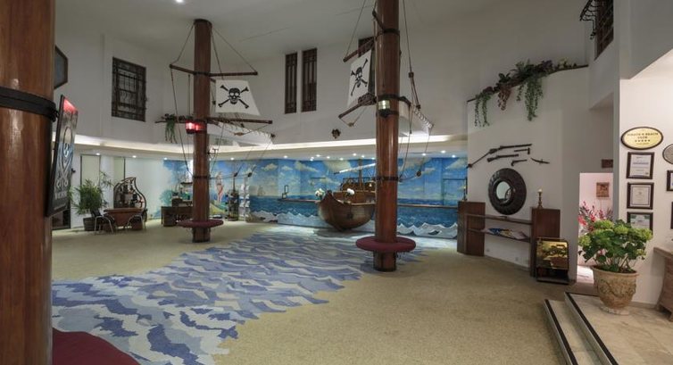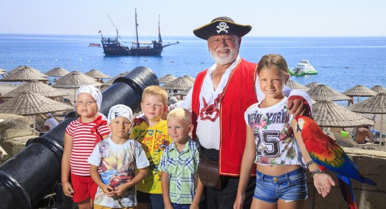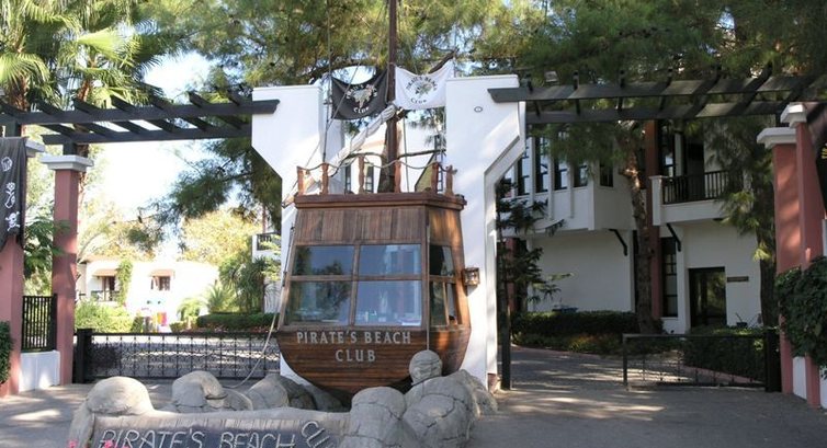 Жили в PIRATE’S BEACH CLUB 5*HV Ультра Все Включено. Отелю 20 лет, территория маленькая, уютная (36 кв. м.). Нас встретили пираты в полной амуниции, главный пират, как положено, без ноги с живым попугаем на плече. Все стилизовано на тему пиратства. Даже в номере нас ждал подарок от отеля : две косынки с пиратскими символами и повязкой на глаз. Так отель приглашает гостей в свою игру. Отель только для детского отдыха. За детьми там присматривают, детей там любят и лелеют. Это правда, есть достоверные отзывы от туристов. Питание вполне нормальное, в баре удалось выпить турецкий кофе с кусочком лукума. Это и есть классический турецкий кофе. Номера стандартные 25 кв. м, Есть особенность- бунгало расположены очень близко друг к другу и можно оказаться очень близко к соседям. Есть небольшой зоопарк с павлинами, которые своим криком смущают рядом живущих гостей.