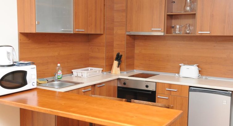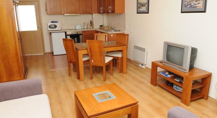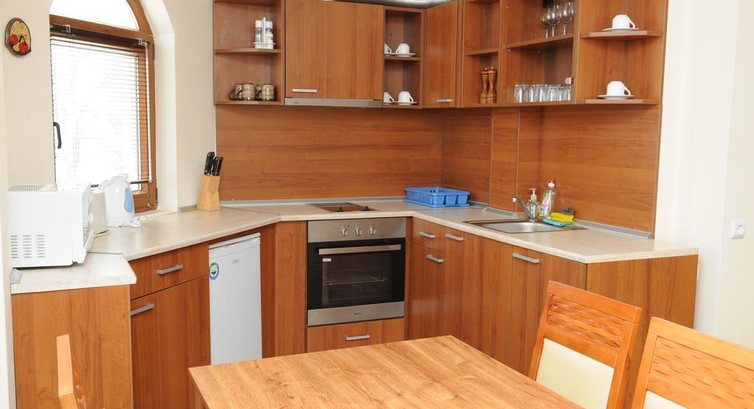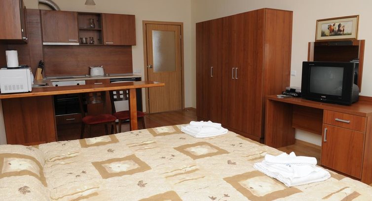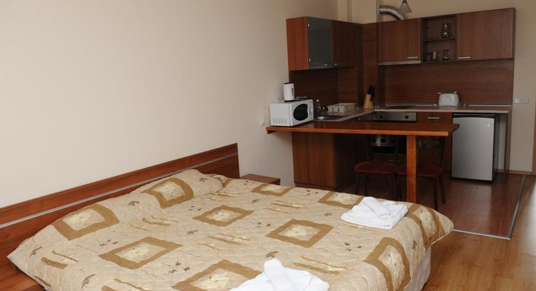 Studio (одна кімната: одне двоспальне ліжко, розсувний диван, кухонний куточок (електрочайник, плита, мікрохвильова піч, тостер, мийка, посуд, столові прилади) та обідній стіл, макс. 3 чол., 38 м2);