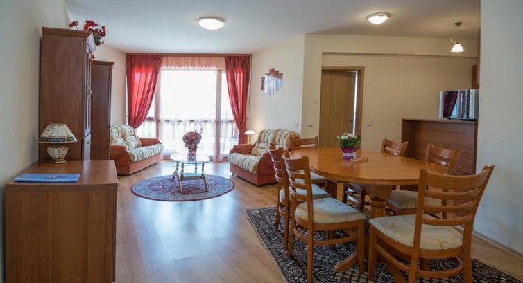 One Bedroom Apartment (спальня з одним двоспальним ліжком, вітальня з розкладним диваном, кухонним куточком (електрочайник, плита, мікрохвильова піч, тостер, мийка, посуд, столові прилади) та обіднім столом, є міжкімнатні двері, макс. 2+2 чол. 55 м2);