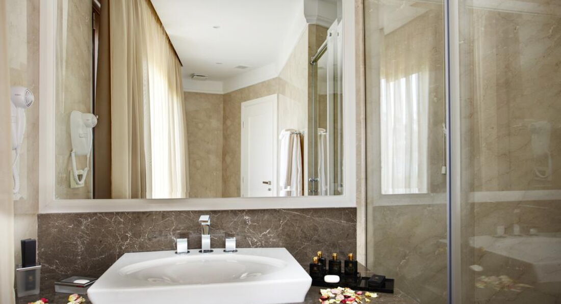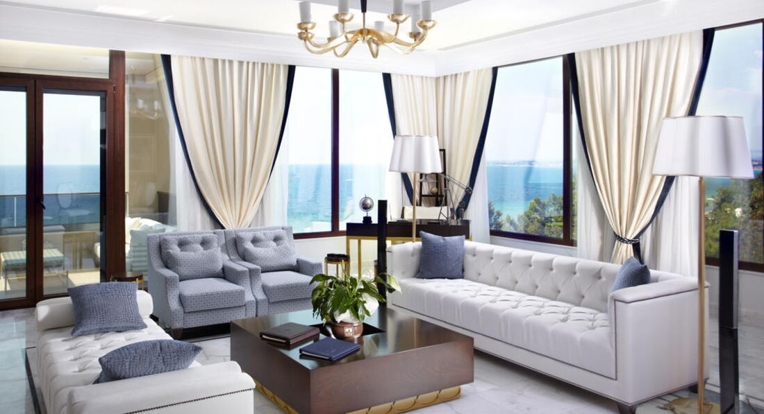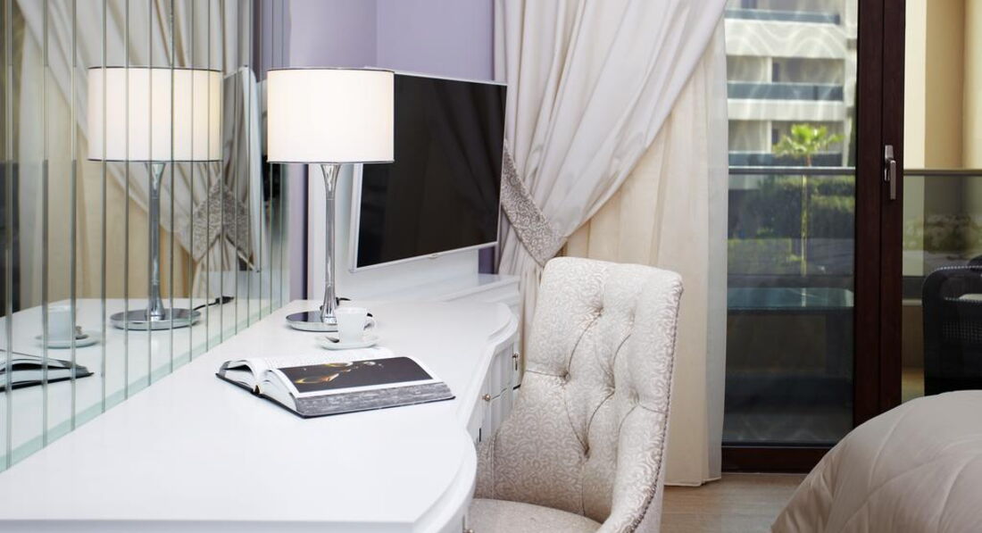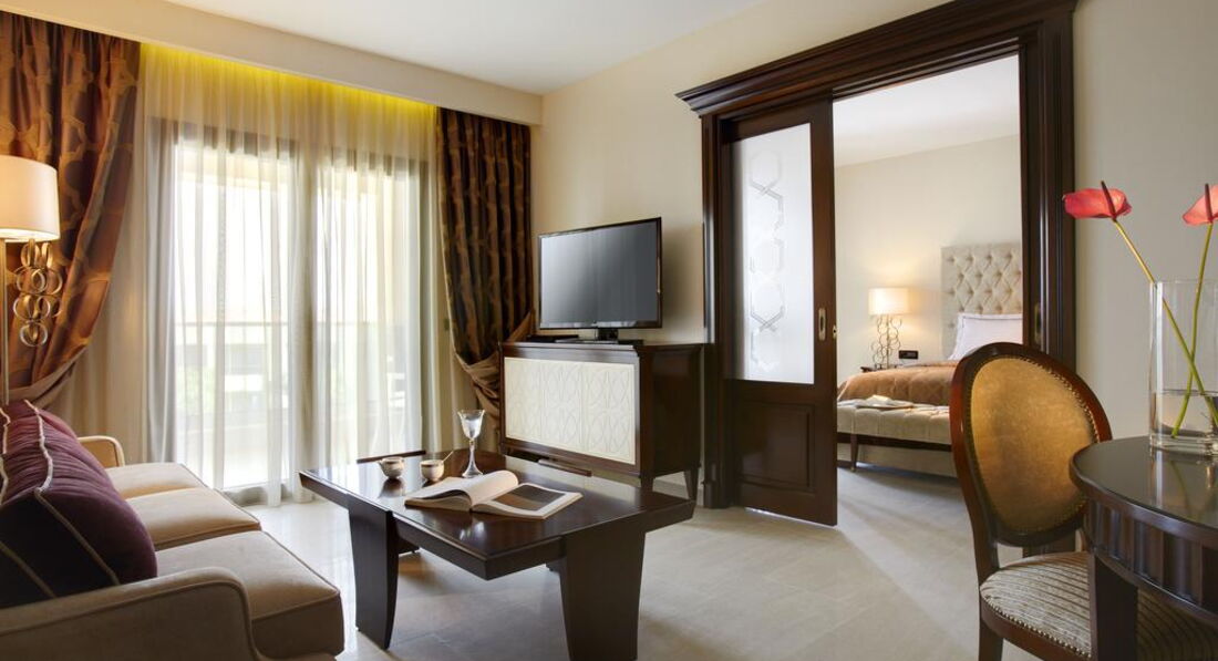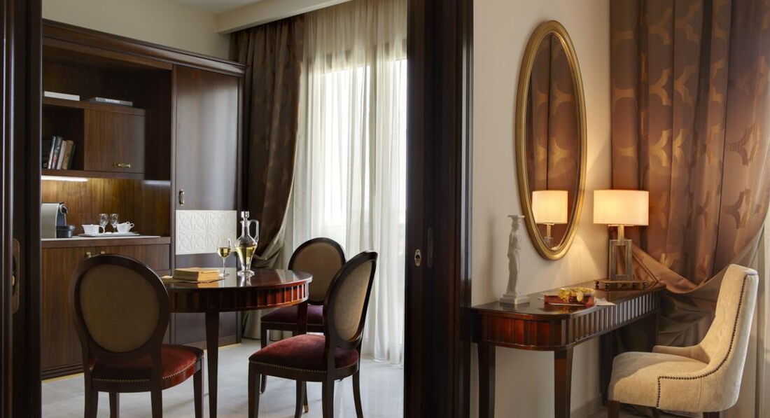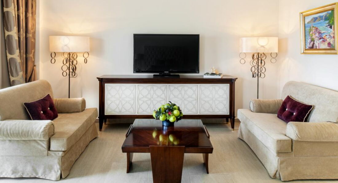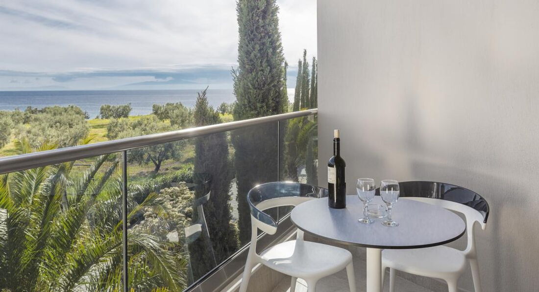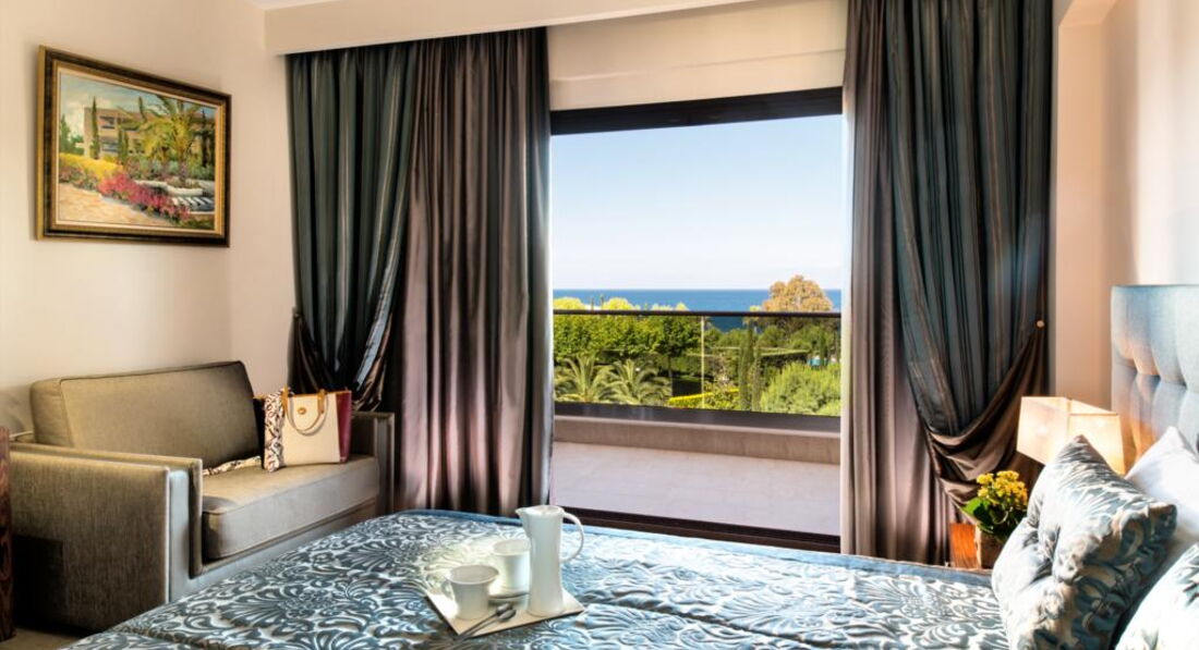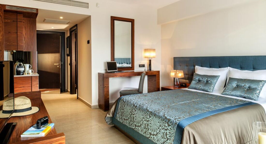 Типи номерів: Eco elegant room Athos view Road view (вид на дорогу та гору Афон, осн. ліжко – два односпальні або двоспальне, дод. – розкладне ліжко-ліжко, макс. 3 чол., 30 м2); elegant room SSV/GV (бічний вид на море, на сад, осн. ліжко – два односпальні або двоспальне, дод. – розкладне крісло-ліжко, макс. 3 чол., 30 м2); junior suite (однокімнатний номер, спальня з вітальнею, осн. ліжко – дві односпальні або двоспальне, дод. – 2 розкладних крісло-ліжка, макс. 3+1 чол., 44 м2); eco junior suite Athos view/ Road view (вид на гору Афон, однокімнатний номер, спальня з вітальнею, осн. ліжко – два односпальні або двоспальне, дод. – 2 розкладні крісла-ліжка, макс. 3+1 чол., 44 м2 ); Superior junior suite (однокімнатний номер, спальня з вітальнею та обідньою зоною, осн. ліжко – двоспальне, дод. – софа, макс. 3 чол., 65 м2); standard suite (двокімнатний номер, спальня та вітальня з розсувними дверима та обідньою зоною, осн. ліжко – два односпальні або двоспальне, дод. – софа та розкладне ліжко, макс. 3+1 чол., 59 м2); Loft suite (однокімнатний номер, спальня з вітальнею, розташовані на 3-му поверсі, 2 балкони, осн. ліжко – queen size ліжко, дод. – софа, макс. 3+1 чол., 55 м2);Номери категорії Prestige Collection