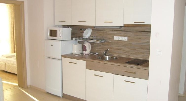 Въехали в отель. В номере не оказалось губки для мытья посуды, половника, открывашки, кружек для чая,фена (хотя в описании он заявлен), средства для мытья посуды и запасного рулона туалетной бумаги! Телевизор в номере не работал, пришлось идти не ресепшен,говорить об этом и только тогда пришел сотрудник отеля,принес антенну и подключил телевизор. Что мешало сделать это заранее, чтобы мы сразу жили в удобствах – загадка! Очень удивляла одна вещь, что бы узнать: где пляж, куда идти на завтрак, когда уборка в номерах, когда принесут новую бумагу или поменяют полотенца, вынесут мусор из номера,нужно было подходить на ресепшен! Кстати, мусор стали убирать, но при заезде в мусорку положили пакет для мусора, в дальнейшем этого не делали! В результате пресловутую туалетную бумагу покупали мы сами, так как допроситься было нереально. Через неделю пребывания в отеле полотенца и постельное белье не заменили, пришлось опять идти на ресепшен и напоминать об этом. Выяснилось, что на 116 апартаментов – одна стиральная машина, которая сломалась! Ещё бесил сей факт,что уборка начиналась в 15-16 часов, когда мы отдыхали после моря. Аргумент был – «слишком много работы»,хотя это не наши проблемы. Завтраки были хороши, кормила нас приятная женщина Юлия. Приносила настоящее коровье молоко, варила кашу, всегда были чай и кофе,оливки, сыр, творог, сладкая выпечка, банница (это булочки с брынзой, причем свежеиспеченные), бутерброды, сосиски. Вообщем завтраком мы были очень довольны, и да, здесь не шведский стол! На территории отеля есть ресторан с нормальными ценами,где всегда есть супчики, вторые блюда, салатики, десерты и прочее. Обедая вдвоём, наедаясь, что называется до отвала, мы вдвоём платили 13-18левов, а один лев = 20рублей. Пляж действительно недалеко, идти минуты 2-3. Но смущает то, что пляж не отеля, а общий. Лежаки и зонтик платные – по 5 левов. Море очень чистое и пахнет арбузом, берег песчаный. Как нам кажется, отель мог бы сделать нормальную дорожку к отелю и сделать его собственным. Вокруг пляжа ведется стройка,она не шумит, но можно увидеть мусор, какие-то бутылки, банки, окурки, нет ни одной клумбы или деревьев-опять же странно! Что-то есть в этом наплевательское. Номер наш был чистый, удобная кровать, шкаф, телевизор, кухонный уголок,к этому претензий нет. Вид был на бассейн,он, кстати, не пахнет хлоркой, что приятно! У бассейна есть лежаки, можно спокойно загорать!