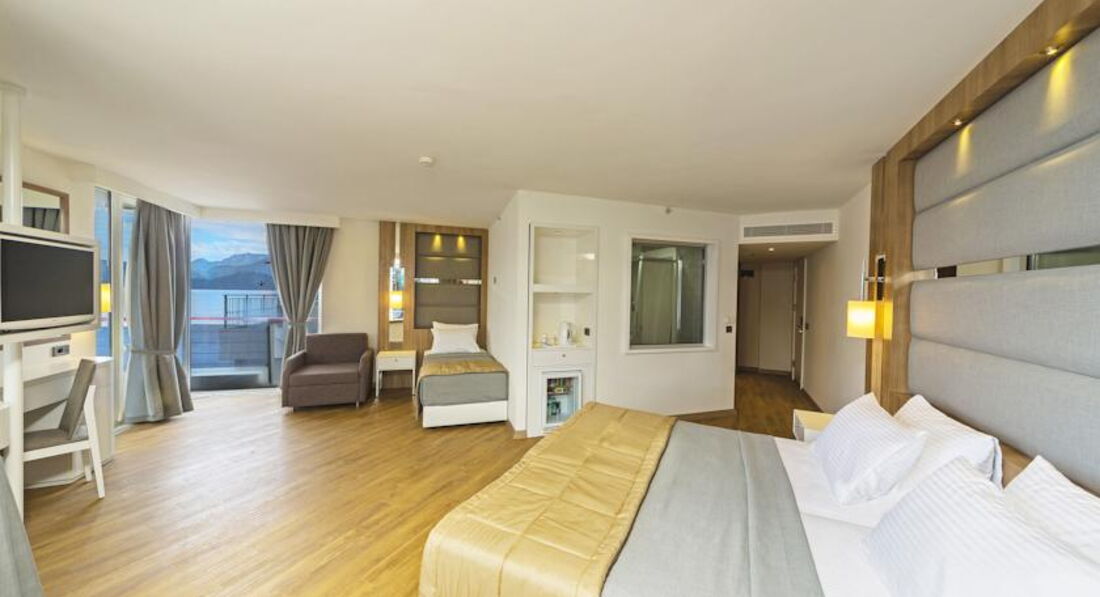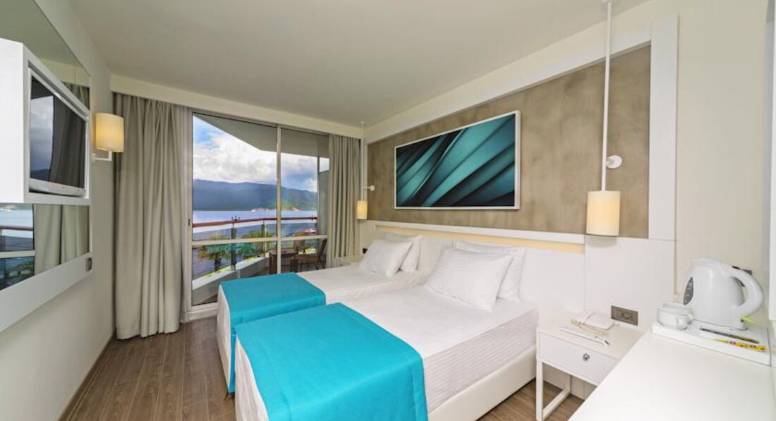 Всем привет! Коротко о всех плюсах и минусах отеля. Начну с плюсов: Перелет- авиа компания Россия . Все было отлично, но были два гоблина пьяных которых сняли с рейса и весь самолет был вынужден час ожидать пока закончится процедура выноса тел. От Бодрума до Мармариса примерно 3часа на микроавтобусе с остановкой. Пролетели быстро и не утомительно. Заселение сразу по приезду 13.30 на обед успели. Номер № 5007 5 этаж очень даже симпатичный. Сейф платный, уборка каждый день. 1б. воды в день приезда бесплатно. Отель уютный, расположение на первой линии. Еда хорошая, напитки приемлемые. Магазины для шопинга рядом. Прокат велосипедов в отеле 25лир в день. Если вылет вечером, то можно продлить номер до 18ч за 25$. У нас был замечательный гид Сергей. Молодой парень, очень ответственный , учтивый . Мы бронировали яхту на целый день с напитками и едой за 400$. Очень круто, нам понравилось. Минусы отеля. В последнюю неделю отдыха нам испортили заезды геронтологии. О боже, пожилые люди,но они штурмом брали ресторан и сметали все и вся на своем пути. Это самый жирный минус. Развлечений в отеле нет, два раза выступала певица под гитару. Я не знаю как оценить плюс или минус, но у моего мужа был день рождения и комплимент от отеля в номер принесли на тарелке два яблока , два апельсина и маленькую бутылочку вина , а иностранке принесли в ресторан на ужин торт и официанты поздравляли с поваром.