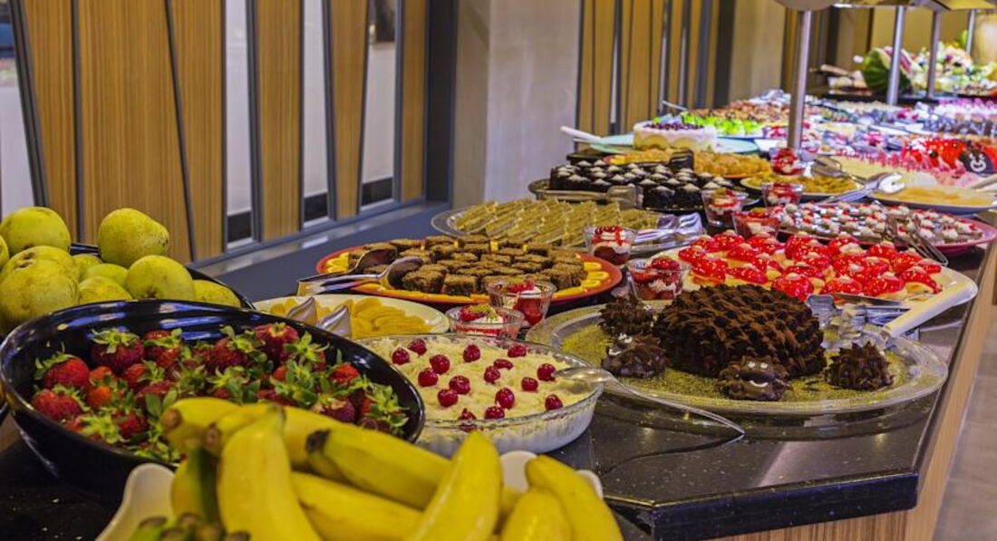 Больше всего здесь нам понравилось питание, особенно ужин! Хорошо, что нет олинклюзива, а то бы мы отъелись по полной программе. На завтраки: булочки, омлет, яйца, оладушки, колбаса/сосиски, фасоль, иногда даже томатный суп был, куча салатов, в т.ч. фруктовый, всякие хрустящие шарики, яблоки, апельсины, иногда дыня, варенья, хлеб, сыры, брынзы и т.д. Чай и кофе не очень: первый чифир из липтона, кофе якобс растворимый. Ужин: каждый день были разные варианты курицы, рыбы, говядины, 1 раз даже дали свиной шашлык, сосиски, колбаса, гарниры - рис, картофель, макароны, равиоли, овощи, 2 вида супа (однотипные, легкие), много разных салатов, большой выбор пирожных, были десерты в креманках, пудинги, пироги и торты, неизменные яблоки, апельсины, дыня почти каждый день. Жаль только арбуз не давали, только если в фруктовом салате или из украшений выковыривать. И напитки в ужин не включаются - тоже минус.