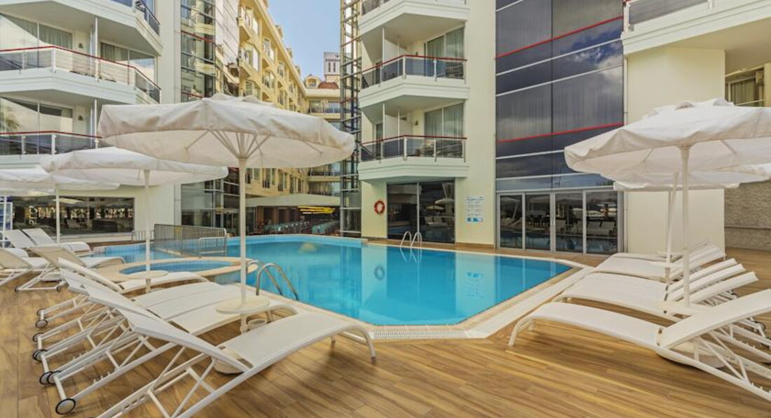 Ездила с сестрой и её другом. Номер на троих оказался с видом на море с большим балконом. Территория маленькая. Зелени практически нет. На первой береговой линии, но в Мармарисе не купаются, возможно из-за припаркованных яхт или сточных вод. Пляж сам по себе не привлекательный и купаться не тянет. Купались на разных экскурсиях: "Пляж Клеопатры", "Коралловые острова", и т.д. В соседнем отеле была дискотека до 2-х ночи, заснуть не получалось. Отель подходит для молодых, энергичных тусовщиков. Детям там делать нечего.