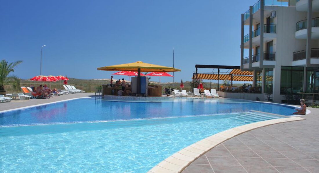 Комплекс знаходиться у тихому місці, за межами міста. Відокремлений від пляжу дюнами та не дуже жвавою дорогою. Рекомендуємо для спокійного відпочинку.