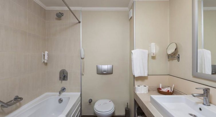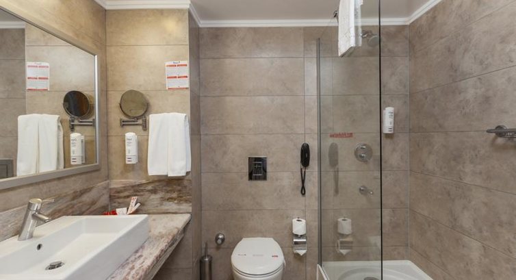 Размещение. Вылетели из Москвы мы в 11 с чем-то утра, в Турцию прилетели часов в 15. От аэропорта до отеля ехали меньше часа. Автобус хороший, с кондиционером. Оператор ТУИ кстати. Заселили нас практически мгновенно. Единственный минус - в номере (909) было три односпальных кровати и ни одной двухспальной. Мы обратились на ресепшн - нам сказали что в настоящее время есть только один номер с двухспальной кроватью, но он на первом этаже. Дали электронный ключ от него, сказали пойдите посмотрите и затем принесите ключ от того номера, в котором не будете жить. Денег никто не просил. Посмотрели номер с двуспальной кроватью - номер хороший, кровать тоже, но на первом этаже останавливаться как-то не захотели. К тому же на всех кроватях матрасы хорошие, упругие - можно сдвинуть две односпальные кровати. Так мы и сделали, оставшись в 909 номере.