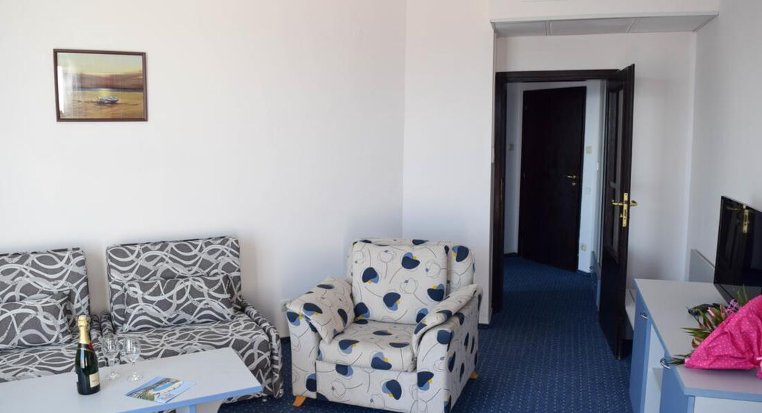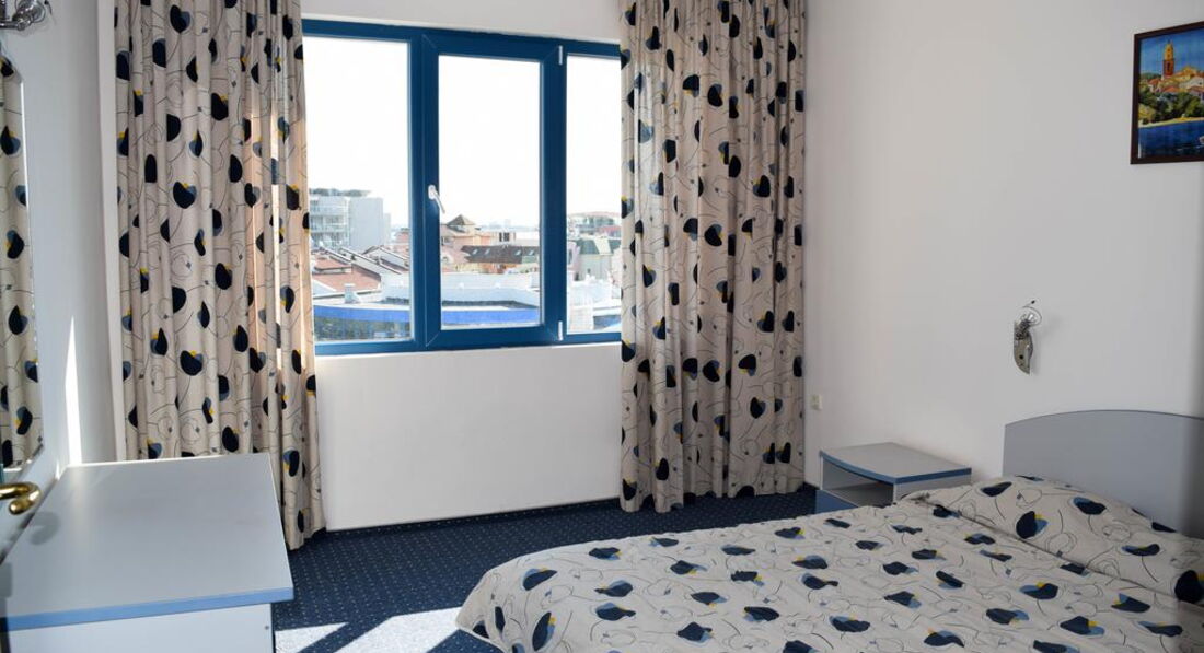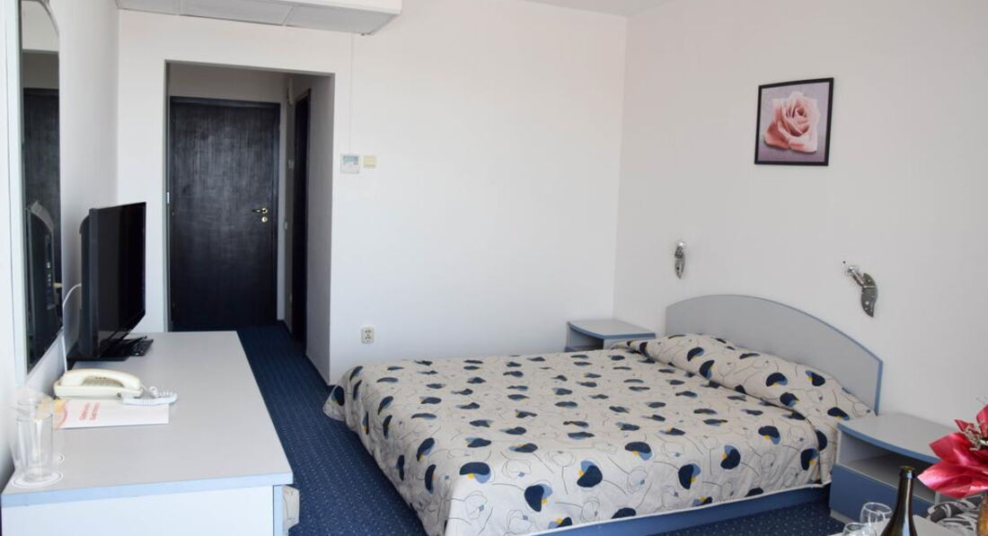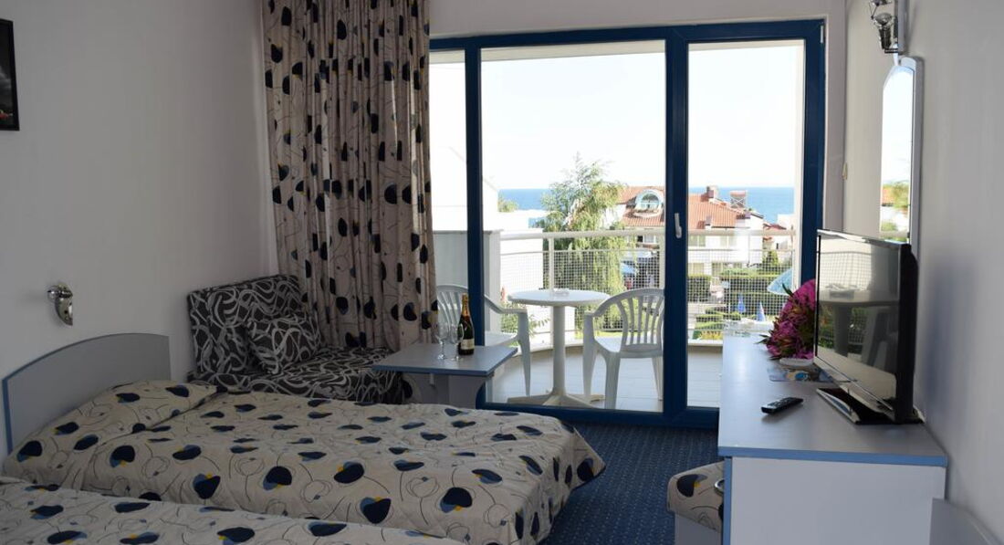 Номера уютные и аккуратные. Из номеров открывается прекрасный вид с одной стороны на море, а с другой стороны на горы Святого Власа. В номере есть телевизор, холодильник, кондиционер, шкаф для одежды, столик с тумбочками, телефон. На полу ковровое покрытие, поэтому детям можно бегать не переживая за холодный пол. Балкон, на котором стоит столик и стулья. Чистая и аккуратная ванная комната. Номера убирали каждый день, полотенце и постельное белье меняли всегда вовремя.