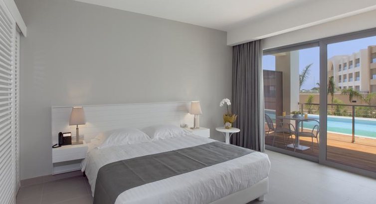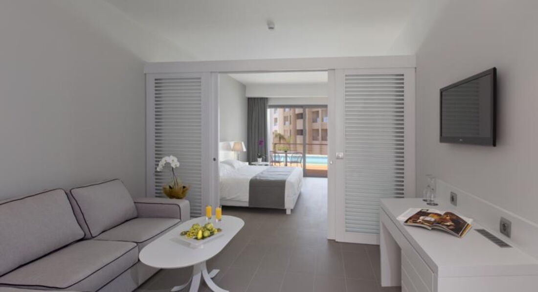 superior junior suitе private pool (перебувають у частині готелю, розташованої ближче до моря, на першому поверсі, однокімнатний номер, осн. ліжко - king-size, доп.- софа (односпальне на запит), невелика тераса з доступом до індивідуального басейну 18м2, макс.3+1 чол., 32 м2);