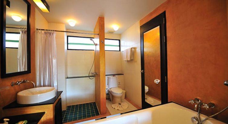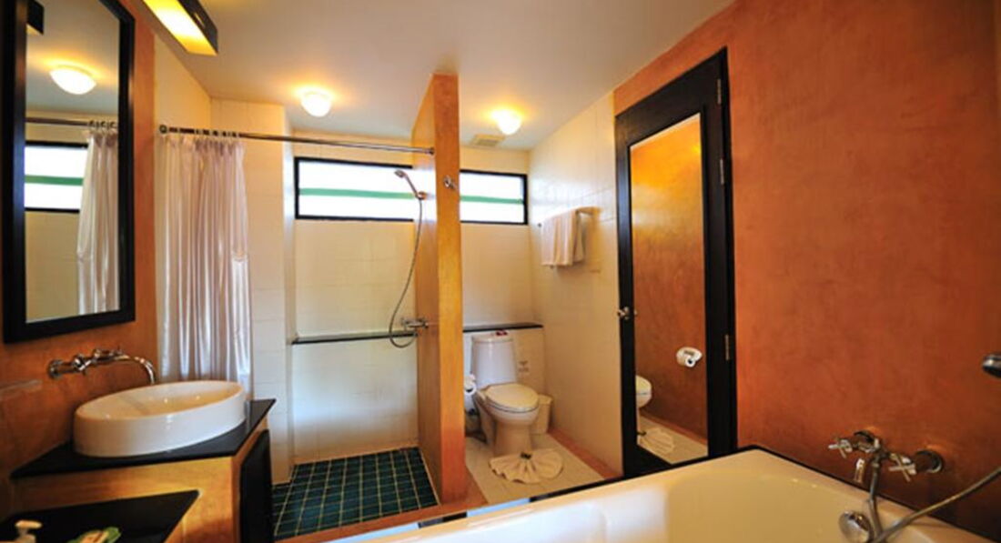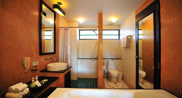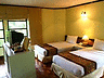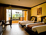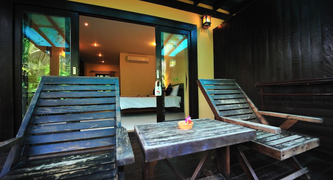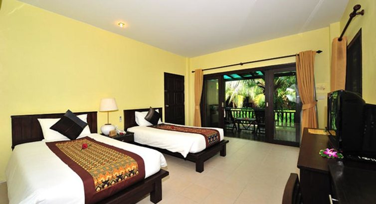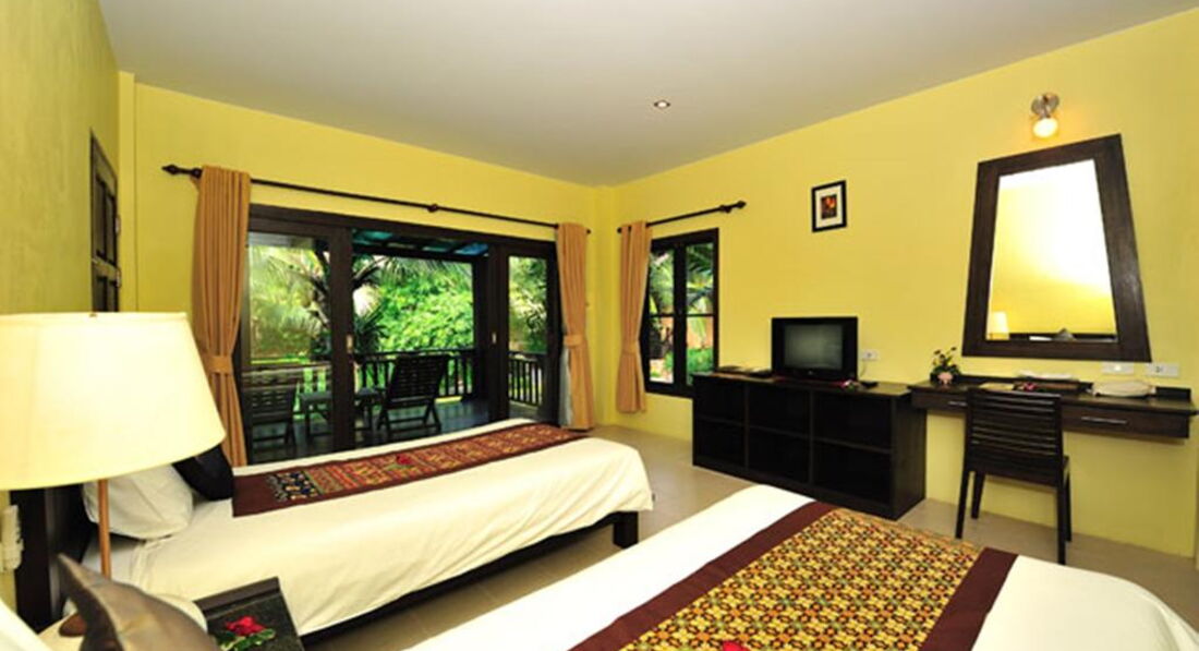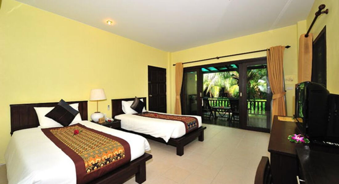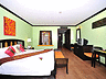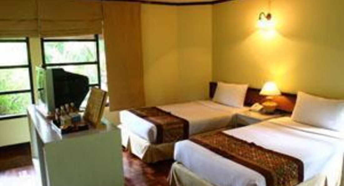 До отеля из аэропорта добирались час, приехали раньше, но заселили сразу, дали талоны на завтраки. В лобби (веранда) персонал не говорит по-русски, но жестами все понимают, проблем не было. Гид Юля (библио глобус) назначила встречу на след.утро. По сим-картам, которые дает по прилету туроператор, связывались с ней по различным вопросам (в основном по экскурсиям и времени вылета); на карте было уже 50 бат, в 7элеван положили 200бат, звонки в Россию дешевые, если набирать +006007(903)123-45-67. Денег хватило на 13 дней. Покупали бунгало, понравилось. Все домики соят на сваях и дорожка к ним тоже, внизу живность ползает (игуаны) и защита от цунами. Много различных растений, птиц; жили как в ухоженых джунглях. Мебель старая, но все работающее. Проблем не было ни с холодильником (он там 120см, хотя в осн.корпусе мини) ни с др.приборами. Бунгало на 2 номера, в 1 номере 2-е комнаты (207), гостинная (большой потолочный шустрый вентилятор, приставная кровать, телевизор, столик, кушетка,хол-к с водой, чайный столик с кофе,чаем,сахаром,сливками; урная и выходом на большую деревянную террасу со столиком,сушилкой и 2-мя стульями) в спальне тусклый настенный светильник, тумба с лампой, шкаф и кровать с хорошим матрасом. Санузел: душ со шторкой, унитаз, урная, раковина с шампунем и гелем.