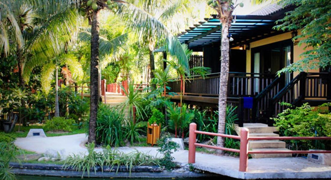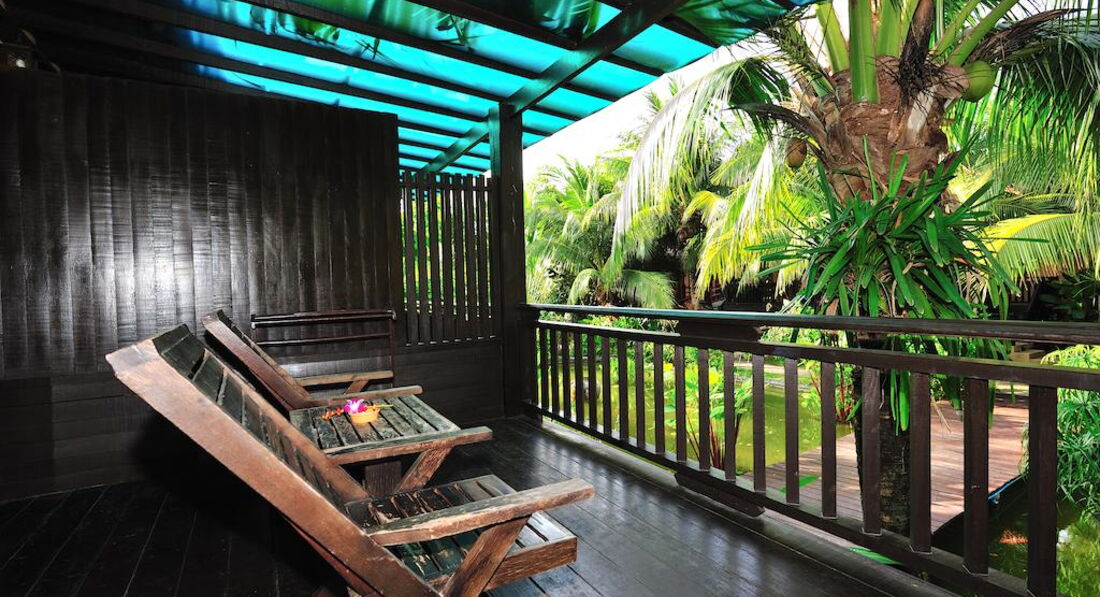 Бунгало в самом конце территории. Свой прудик с мостиком, спокойно, и такое ощущение как будто в джунглях.