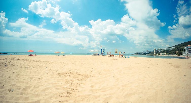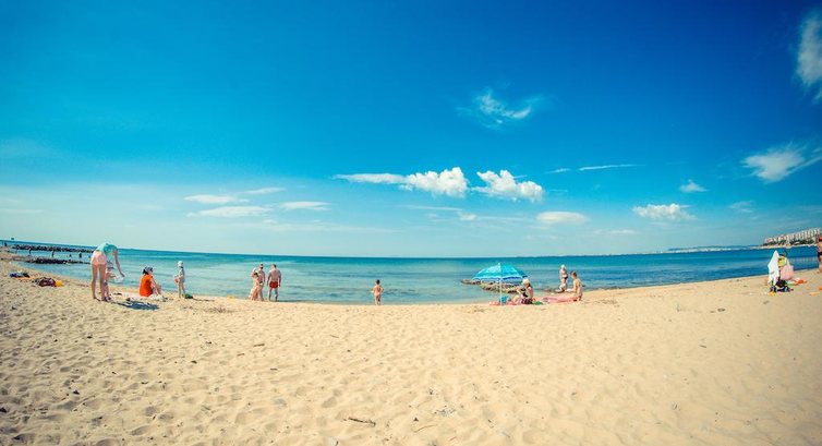 Піщаний пляж; парасольки та шезлонги - платно, пляжні рушники не надаються.