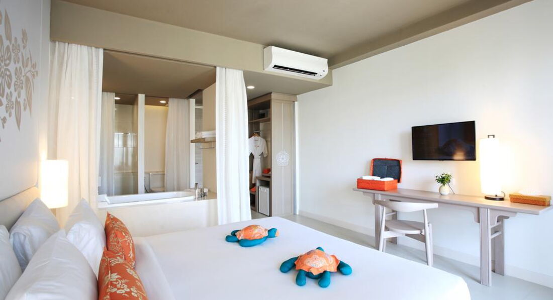 Типи номерів: • 70 superior pool view (33 кв.м, 42 dbl/28 twin, макс.2+1 чол, вид на басейн, 2-5 поверхи) • 18 superior pool access (30 кв.м, двоспальне ліжко, макс.2+1 чол, прямий доступ до басейну, 1-й поверх) • 9 deluxe pool view (53 кв.м, двоспальне ліжко, макс.2+1 чол, вид на басейн, 6 поверх) • 2 junior suite pool view (61 кв.м, двоспальне ліжко, макс.2+1 чол, вид на басейн, 6 поверх) • 1 junior suite pool access (61 кв.м, двоспальне ліжко, макс.2+1 чол, прямий доступ до басейну, 2-й поверх) • 1 two-bedroom suite (78 кв.м, 2 спальні, макс.4+1 чол, вид на басейн, 6-й поверх) Є 1 номер для людей з обмеженими можливостями (superior pool view). Є номери, що з'єднуються. Компліменти іменинникам – торт, молодятам – прикраса ліжка.У номері: • кондиціонер • ТБ (є російський канал) • телефон • Wi-Fi (безкоштовно) • стіл стілець • софа (крім superior pool access) • сейф • міні-бар • 2 пляшки води щодня безкоштовно • набір для приготування чаю/кави • окремі дощовий душ та ванна (з туалетним приладдям) • фен • праска – на запит • балкон (номери pool access – тераса)