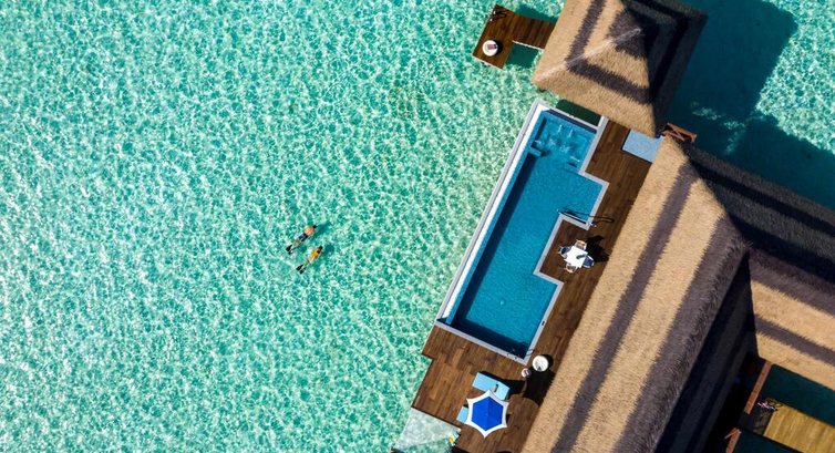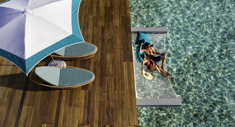 • 2 Aqua Villa (113 м2; макс. 2+1+1 infant). Водяні вілли з двома спальнями, одна з яких розташована під водою. Ванна кімната з ванною, душем і душем на відкритому повітрі, тераса з приватним басейном з видом на лагуну, шезлонгами, альтанка з зоною відпочинку, прямий спуск у воду