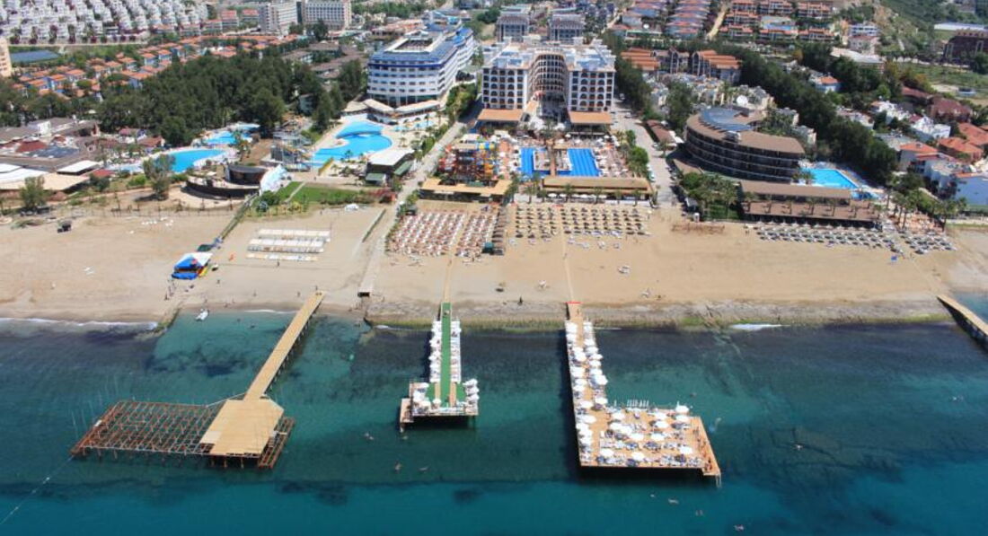 Отель расположен в 12 км не доезжая Алании, в деревушке (так мы называли) Конаклы. От аэропорта Анталии далеко, около 1,5-2 часов езды на бусе. Отель первой линии, хорошей архитектуры и классного интерьера. Рассчитан в основном на немецких, скандинавских туристов. Ну, местные само собой. Следовательно персонал не русскоговорящий, кроме guest relation и девушка Вероника из анимационной команды. Крепкая 5-ка: обслуживание хорошее, питание отличное, разнообразное; напитки по турецкой концепции ( сам не пью, но никто не жаловался😀). Единственная странность-отсутствие тапочек-халатов и почему-то зубной пасты и щёток. Заселение с 14.00 без проблем ( кстати чек аут вообще секундный и безпроблемный). Территория достаточно большая, как бы поделённая на три зоны: внутренний двор и терраса со столиками ( всегда можно найти свободный), причём часть внутреннего дворика окаймлена самим зданием отеля ( он в виде подковы построен). Это зона релакса. Вторая зона бассейн, горки. Тут все как обычно, шезлонгов достаточно, но занимать все-таки надо пораньше. Есть замечательный лягушатник. Анимация дневная есть, но мы как-то этим не интересовались, поэтому сказать нечего. Вторую и третью зону разделяет seaport cafe - все то же, что и в main restaurant, но только не оьходя от пляжа/бассейна. Третья зона - пляж. Очень большой, но малолюдный. Тут есть одна особенность местного побережья - вулканическая плита, поэтому заход в море в берега большая проблема, просто неудобно это делать. Но есть пирс, также большой; вот с него в море и заходили. Обслуживание, как уже писал, хорошее и, что запомнилось с хорошей стороны- не такое навязчивое, как привыкаешь в Турции. Вообще очень качественный отель, со своими минусами, но то, как сумели построить работу, оставляет только положительные эмоции. Отель расположен как бы в конце Конаклы, добраться туда можно на местном автотранспорте (1 лира) или пешком ( до Мега Молла около 30 мин. ходом). Кстати в этом молле хороший шоппинг. До Алании от отеля ходит автобус, где-то 20 минут до центра, 3,5 лиры. В районе Алании первый раз отдыхали, не знаю, но вода в Кемере чище. Для расширения географии отдыха по анталийским регионам очень классный отель.