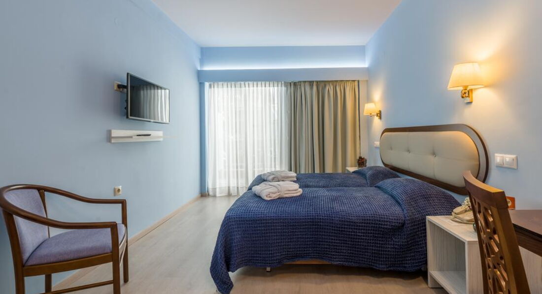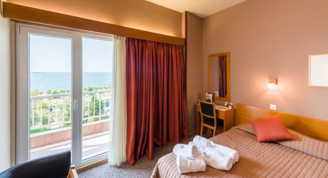 Територія та послуги: Інтернет - безкоштовний Wi-Fi та безкоштовний інтернет з підключенням. Бар у фойє готелю Ресторан зал для сніданків Конференц зал - 3 конференц-зали (місткістю від 10 до 200 місць) Сейф на рецепції (безкоштовно) Трансфер за 20 м від готелю автобусна зупинка до центру міста. Розміщення з тваринами за запитом Живлення: Сніданок. Пляж: Найближчий пляж Агія Тріада за 20 км. До оплати приймаються кредитні картки: Visa, MasterCard, American Express.