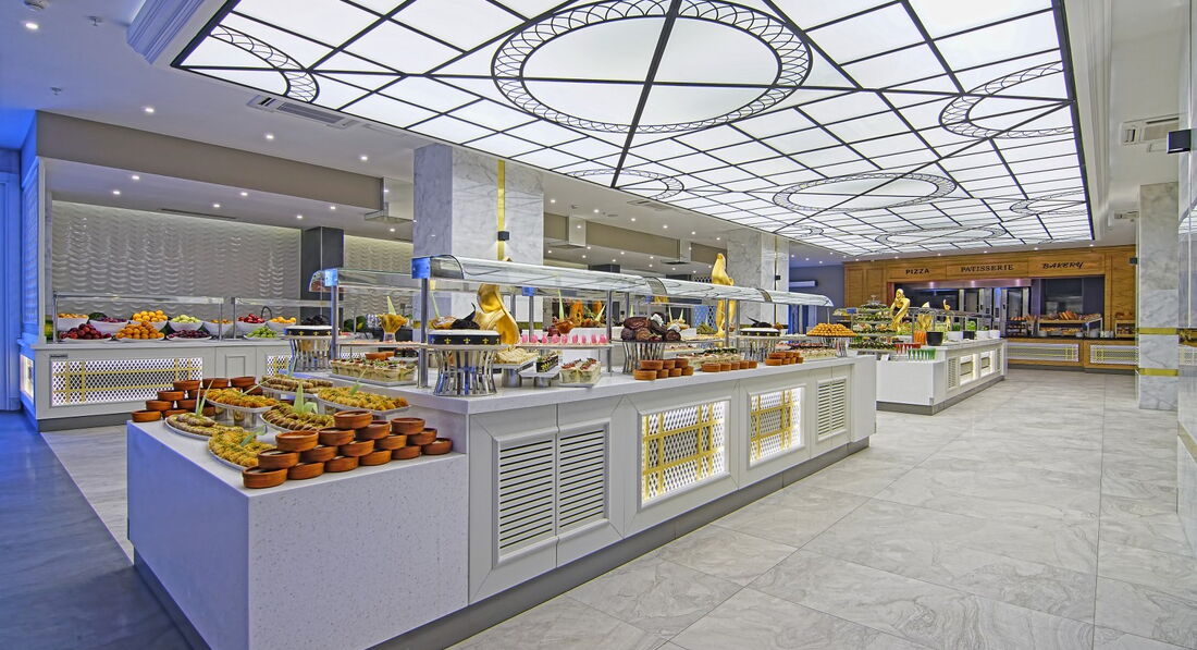 Завтрак: молочные каши разные горячие, молоко в кулерах горячее и в детском меню холодное, разные хлопья видов 10, варенья видов 10, жидкий шоколад по вкусу как нутелла. Горячие оладьи, яичница, омлет. Разные булочки с шоколадом, абрикосами кунжутом и просто. Сосиски сыров видов 15. Вкуснейший йогурт видов 6. Сухофрукты, халва, лукум. Сосиски. Овощи фрукты. Супчик протертый.