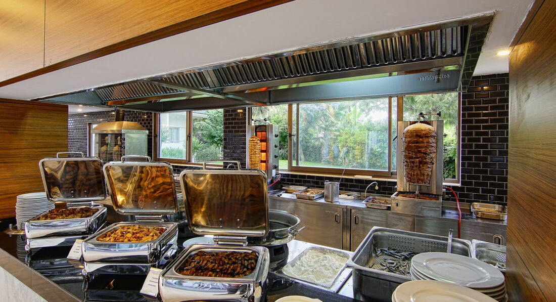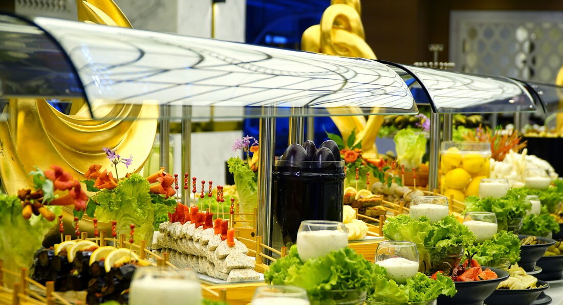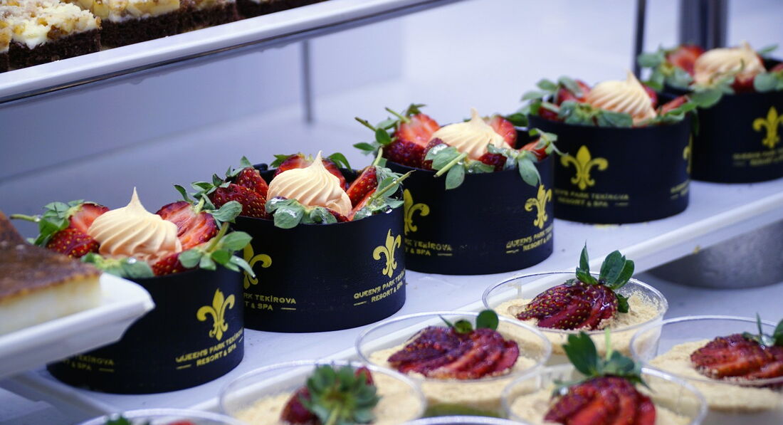Море десертов: жареные бананы, эклеры, торты пирожные , турецкие сладости, пахлава, крем и прочее.