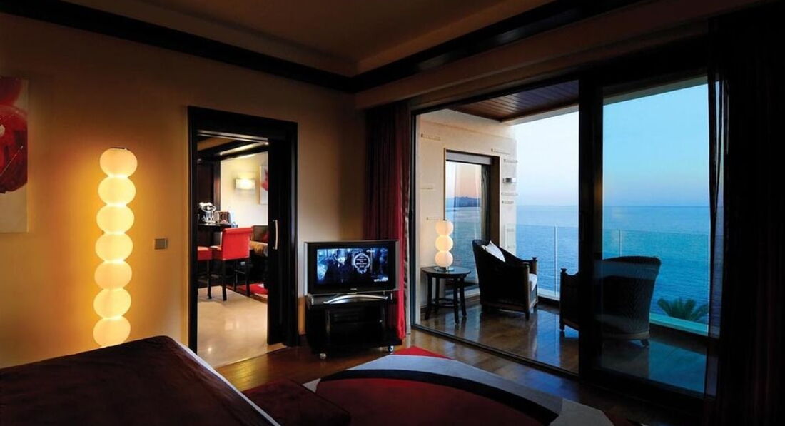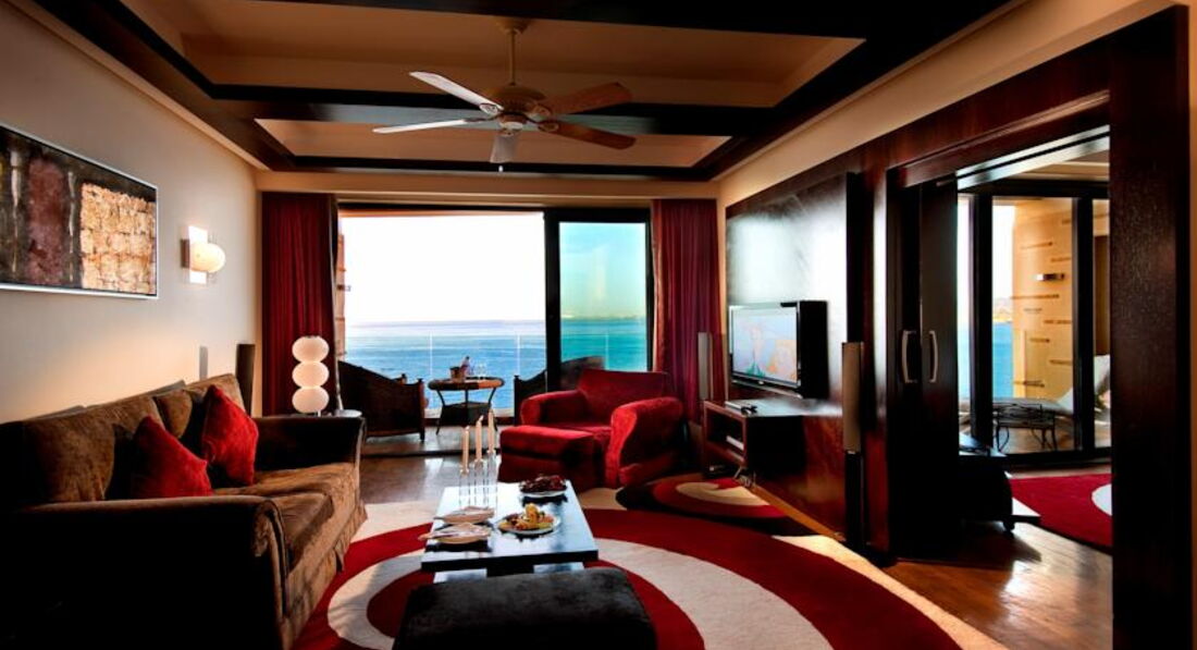 Honeymoon Suite 3 номери. Інтер'єр для молодят. У вітальні зона їдальні, зона бару, ТБ, DVD плеєр, панорамний вид на море. На балконі два стільці та стіл. У спальні також є балкон з видом на море. У ванній кімнаті є джакузі з видом на море, душ, лазневе приладдя, халати, капці. Площа номера 63 – 93 кв.м. Максимальне розміщення 2 особи. У номерах: двоспальне ліжко, сейф, мінібар, індивідуальний кондиціонер, приладдя для чаю та кави, ТБ, телефон (платно), фен. Додаткові послуги: підготовка номера до сну, 1 користування пральнею на кімнату за весь час перебування, фрукти по заїзду, східні солодощі, 1 ваучер на 20 євро/ на номер за час проживання в ресторанах.