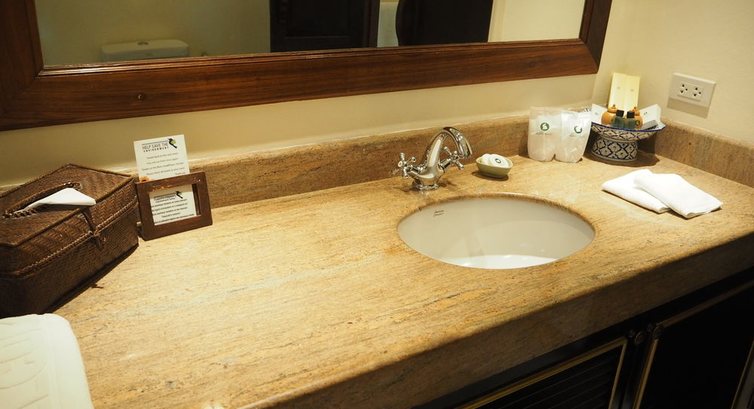 На двоих был номер 45 кв.м, с огромной кроватью примерно 2х2 м, плюс широкая кушетка. Душ, туалет, фен, телевизор, кондиционер, вентилятор, холодильник, микроволновка и чайник. На первом этаже под нами видела в номере плиту, у нас её не было. Сейф в номере. Мебель деревянная, не новая, но всё выдержанно в едином стиле. Убирали чисто, постельное белье, полотенца - всё как положено. В ванной стандартный набор - салфетки, туалетная бумага, ватные палочки, мыло, шампунь и кондиционер. Халаты и тапочки. Большие зонты на случай дождя.