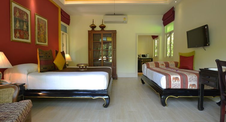 Отель оказался достаточно просторным, очень зеленым и чистым. Заселили нас очень быстро (правда, в Тайланде нигде с заселением проблем не наблюдала), номер оказался огромным и очень красивым. Тиковая мебель, полноценная кухня, зачем-то две большие кровати :) (случайно увидела в другом номере, что вместо втрорй кровати у них стоит большой обеденный стол). Чувствуешь себя дорогим гостем в дорогом месте. Кстати, на фото плитка на полу выглядит потсканной... на самом деле она искуственно состаренная и отлично вписывается в интерьер.
