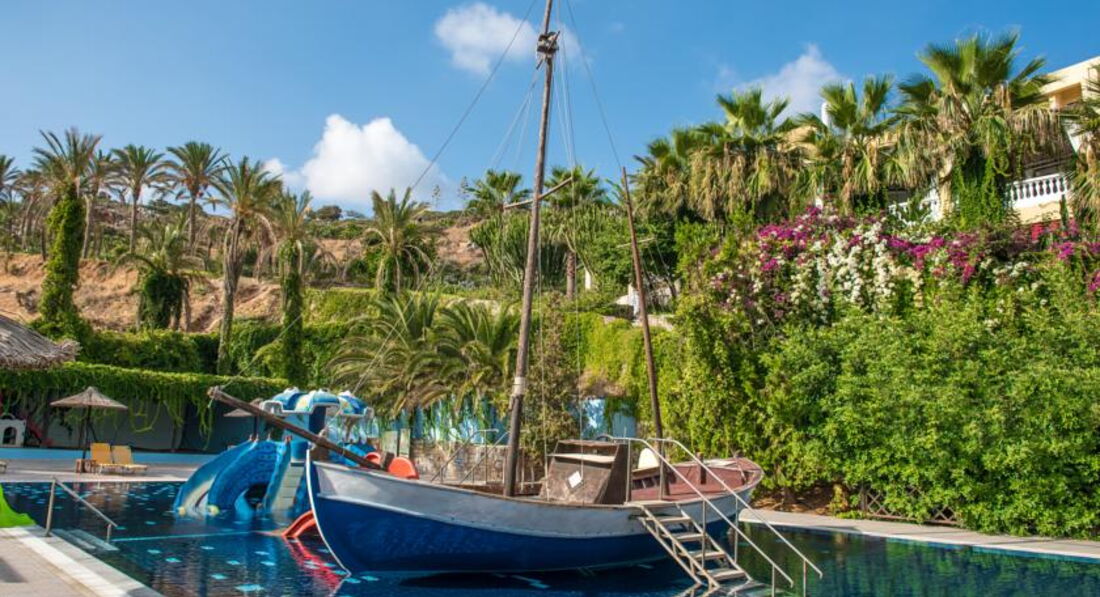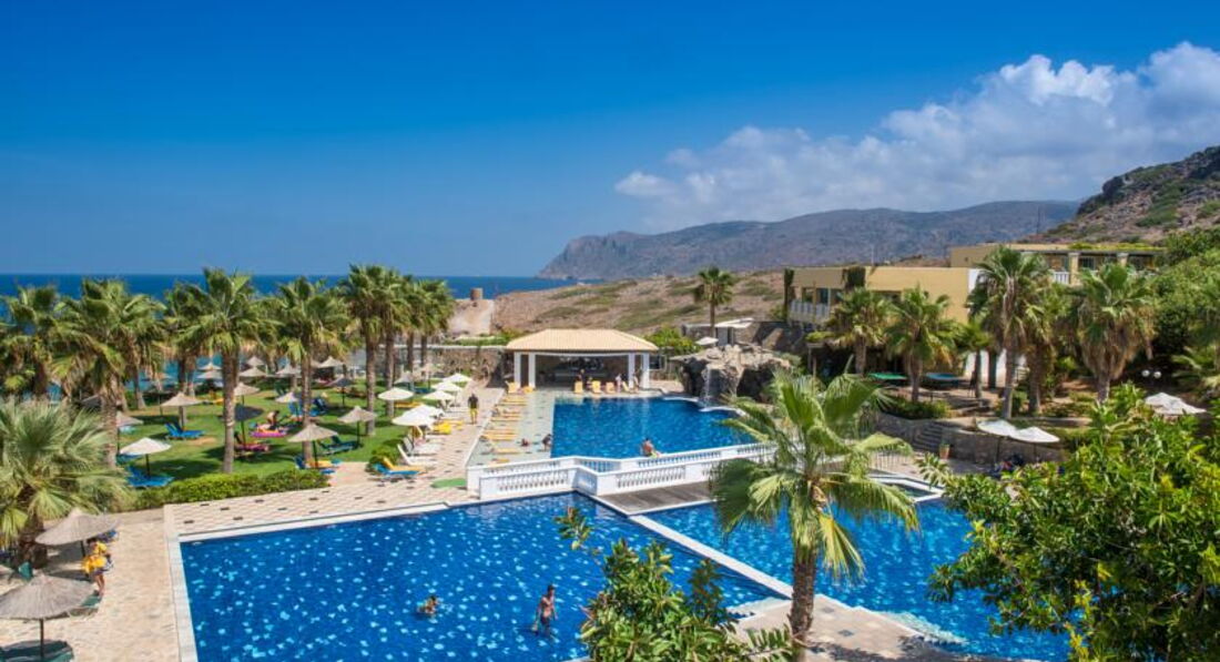 Розвинений готельний комплекс, розташований на березі моря, у спокійному місці. Пропонує широкий вибір типів розміщення, різноманітне харчування та гарний сервіс. Велика доглянута територія з садами та оливковими гаями. Є свій водяний парк для дітей. Звертаємо увагу, що готель розташований на височині, тому не підійде для гостей з обмеженими можливостями пересування. Рекомендуємо для сімейного, романтичного відпочинку, а також для туристів, які шукають додатковий комфорт та усамітнення.