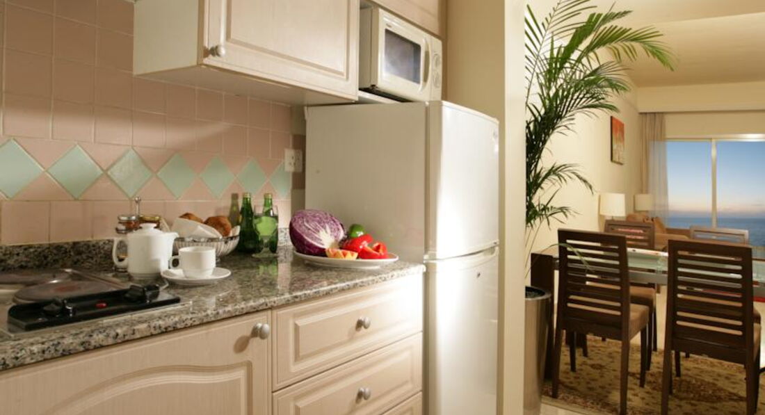 Отдыхали с 23 по 31мая 2017г вдвоем. Летели из Киева. Трансфер бесплатный. Заселялись ночью. Номер был стандартный на 12 этаже. Все понравилось . Две комнаты смежные с кухонными принадлежностями холодильник, микроволновка, чайник, чашки, стаканы, чайные ложки, кофе , чай , сливки сахар пополняются каждый день. Здесь же большой шкаф, телевизор , диван, журнальный столик. Во второй комнате две отдельные кровати прикроватные тумбочки, телевизор, шкаф.Шампуни, мыло , гель для душа пополняли каждый день. Воду в номер приносят каждый день. дополнительно можно купить в супермаркете рядом недорого .Постель тоже меняют каждый день. Персонал приветлив. Если , что то надо принесут тут же.Утюг , гладильную доску, переходник или дополнительную посуду. Питание очень понравилось . Большой выбор всего и продукты качественные. Мы брали завтрак ужин и этого было предостаточно. Если чего то хочется дополнительно в обед можно купить в супермаркете большой выбор фруктов . У кого выпадает день рождения во время отдыха поздравляют именным тортом. Очень приятно. С недостатков можно отметить,