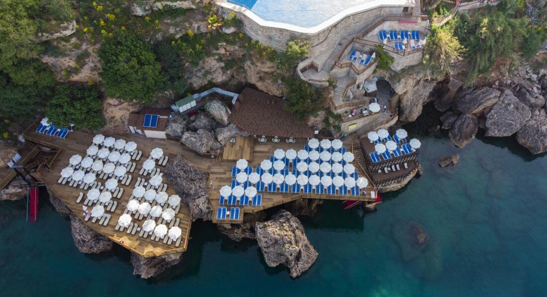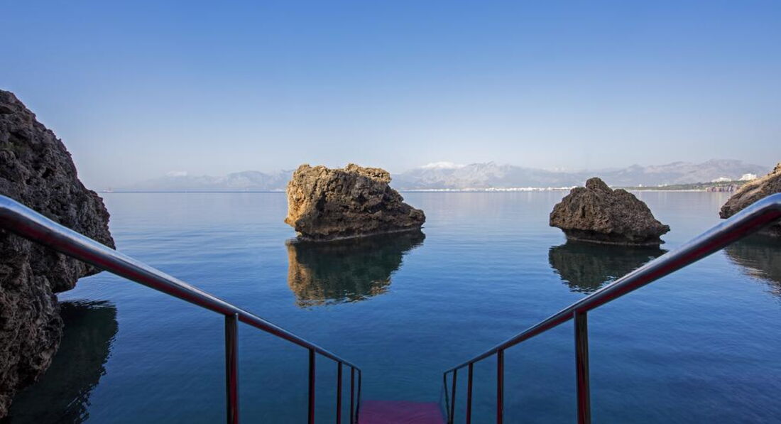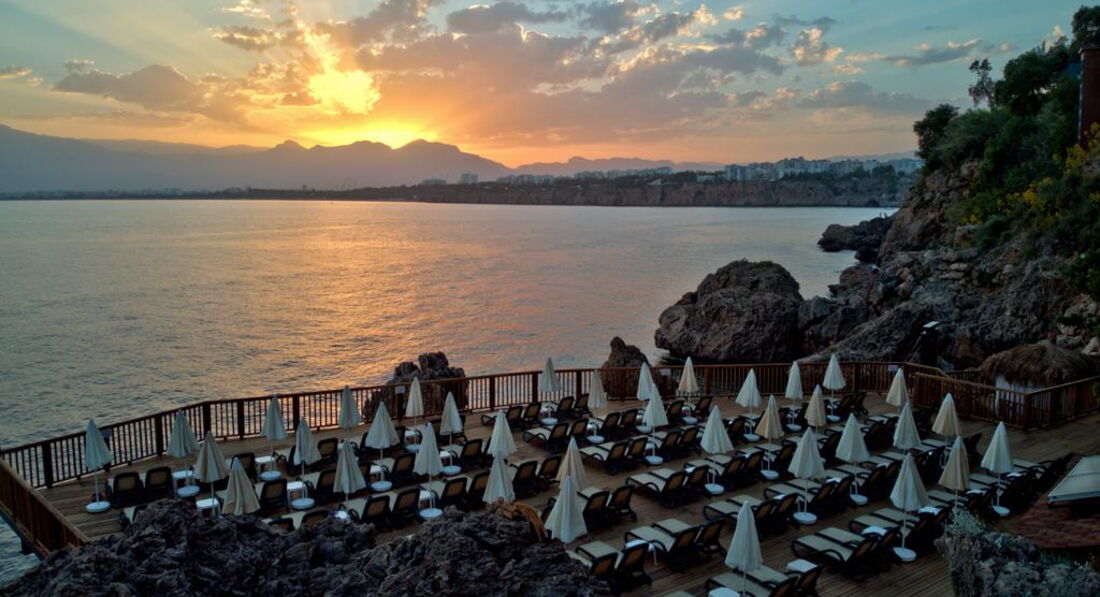 Расположение отеля - супер. Рядом парк с набережной и пальмами, через него можно выйти в старый город и на пристань. 10 мин пешком. Улица Ататюрка с кафешками и лавочками - 5 мин. До шоппинг центра Марк Анталия - 20-30 мин пешком. Отель на утесе, спуск к морю по деревянным мосткам. Пляжа нет.