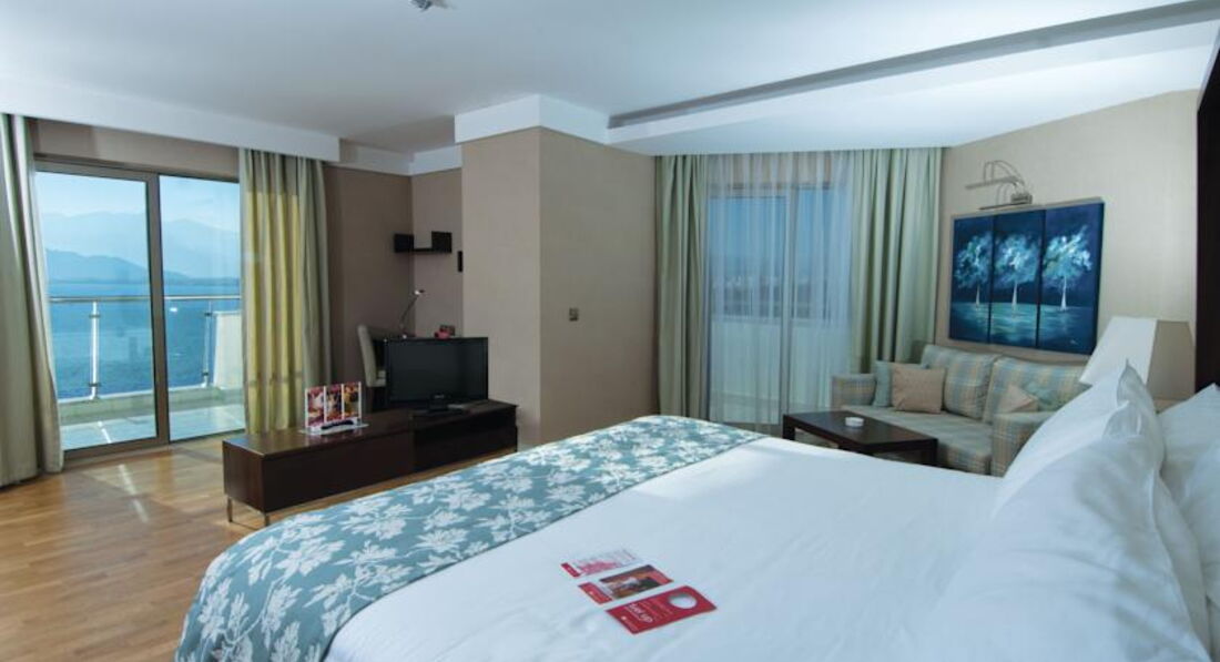 Номер у нас был делюкс с видом на море на 6 этаже. Прямой вид на море и горы. При входе небольшая комната с диванчиком и балконом, далее - спальня с тв и затем еще одна небольшая комната, типа гардеробной тоже с балконом. Ванная комната с душем и ванной. Мебель в приличном состоянии, набор для чая/кофе, чайник, минибар, утюг, халаты/тапочки - все имелось.