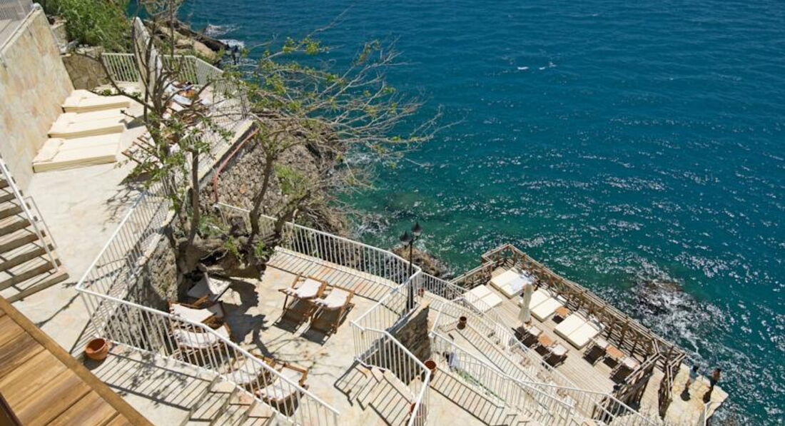 Практически нет территории, от основного здания через небольшую дорогу есть ресторан с панорамным видом на море и Анталию. Чуть ниже по ступенькам море. Пляжа как такового нет, на скале сделаны деревянные пирсы, на которых можно загорать и с них же прыгать в море! Лично мне такой вариант пляжа нравится гораздо больше, чем банальный широкий пляж с песком.