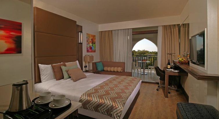 Размещение. Мы приехали в отель в шесть часов вечера, так что сразу получили номер. Отель состоит из корпусов, расположенных полукругом. Номера небольшие, но чистые, современные с большой террасой. Но есть один нюанс. Сцена, где проходит анимация расположена внутри полукруга. У нас был номер во втором корпусе, в некотором отдалении от сцены, но все-равно по вечерам было очень шумно и приходилось закрывать дверь на террасу. Но если вы без маленьких детей и рано ложиться спать вам не нужно - то музыка не помеха ))