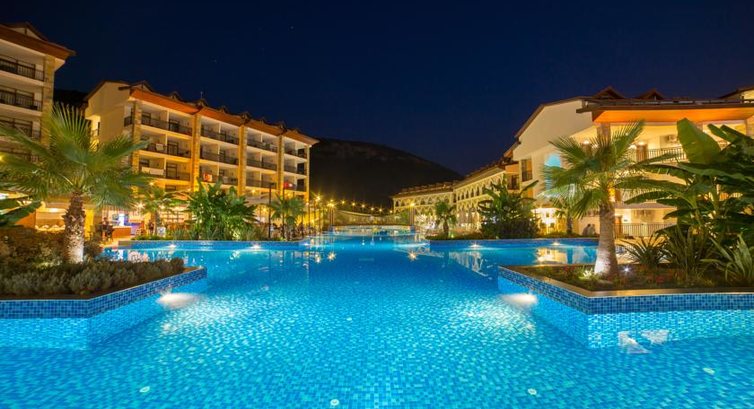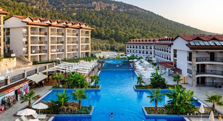 Питание хорошее на завтрак: сухие завтраки,мюсли,омлет,булочки,колбаса,творог,йогурты,арбузы,дыни,яблоки,груши,персики,сыры,оливки и т.д. Обед: турецкие супчики,рис,спагетти,картофель фри,курица,печень,мясо,тушеный картофель,сладости и фрукты. На ужин обычно что-нибудь жарят на гриле-рыбу, мясо, курицу. В барах на пляже и у бассейна всегда можно сделать бургер, съесть картофель фри или лепешку, а также фрукты и оливки. Голодным там остаться невозможно! Территория достаточно уютная, есть детский бассейн с горками, большой бассейн с двумя горками,которые включают по времени. Очень много турков с детьми они в основном у бассейнов. На пляж ездит автобус-кабриолетт каждые 15 минут,ехать 3 минуты. На пляже есть бар лежаки,зонты,полотенца все бесплатно. В номере сейф бесплатный. Вокруг зеленые горы- пейзаж великолепный!