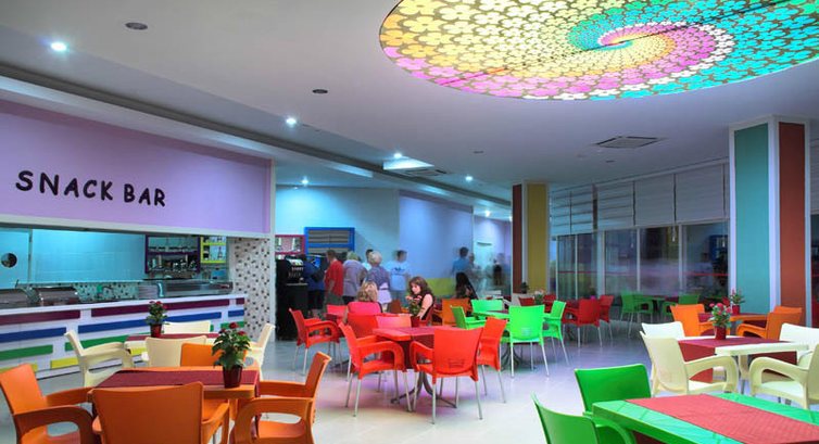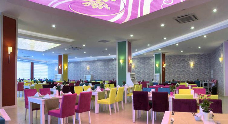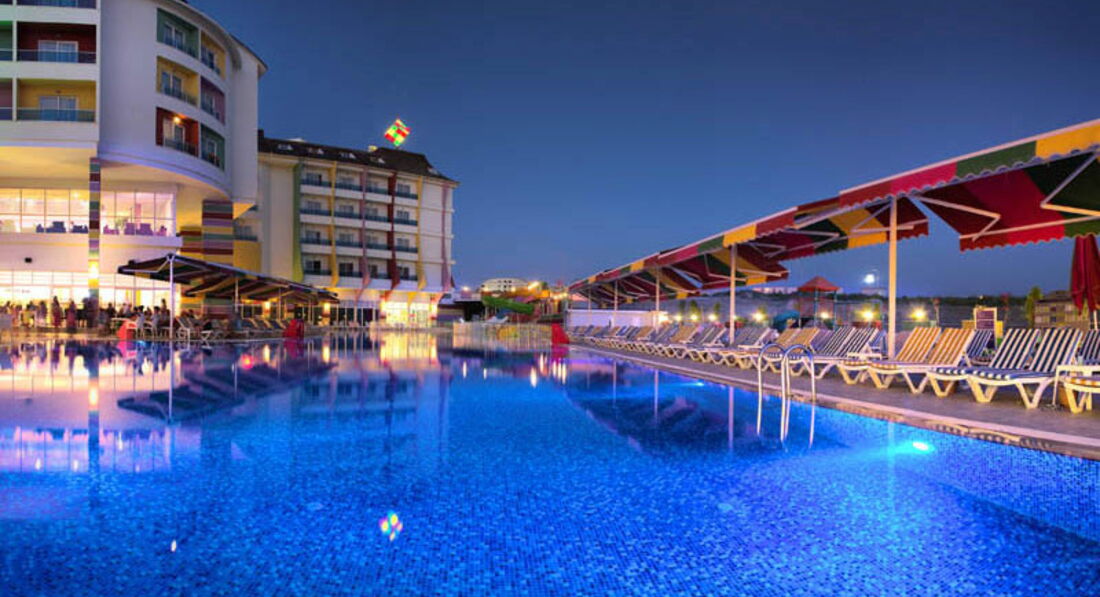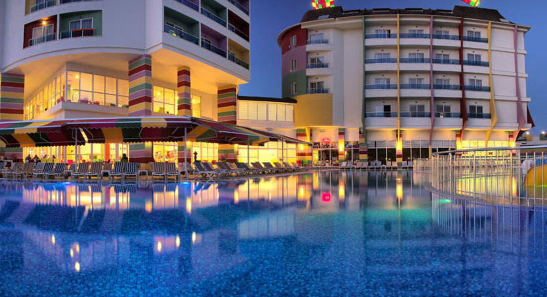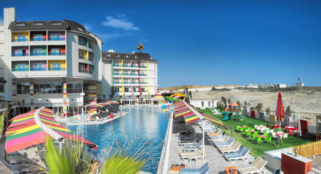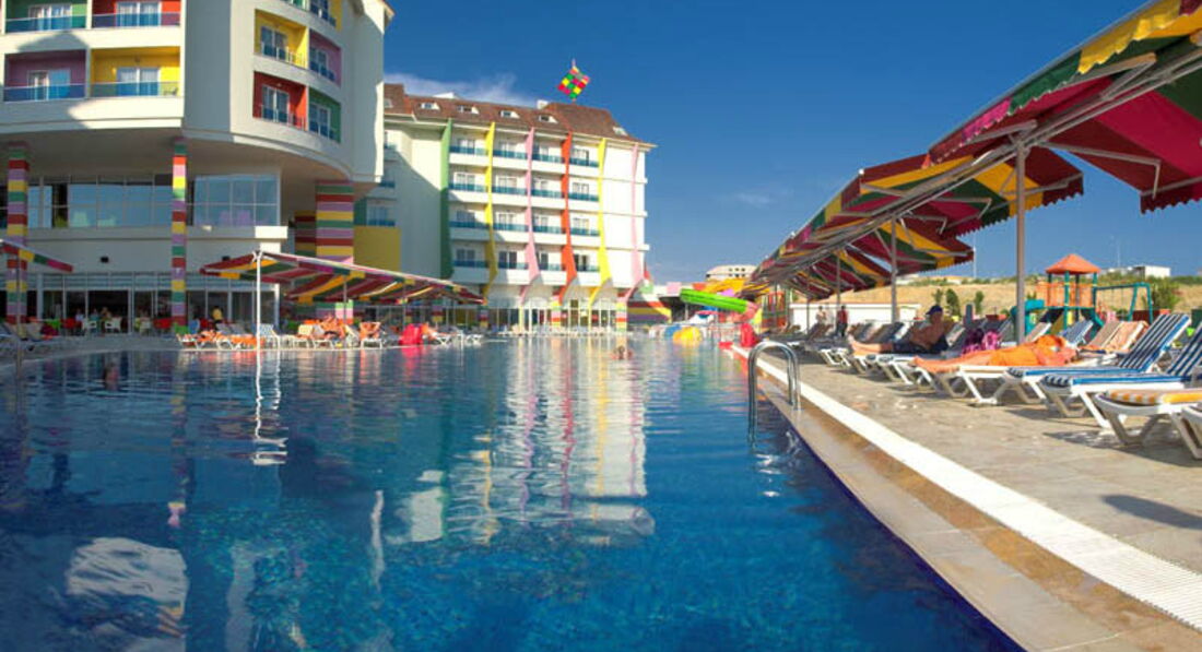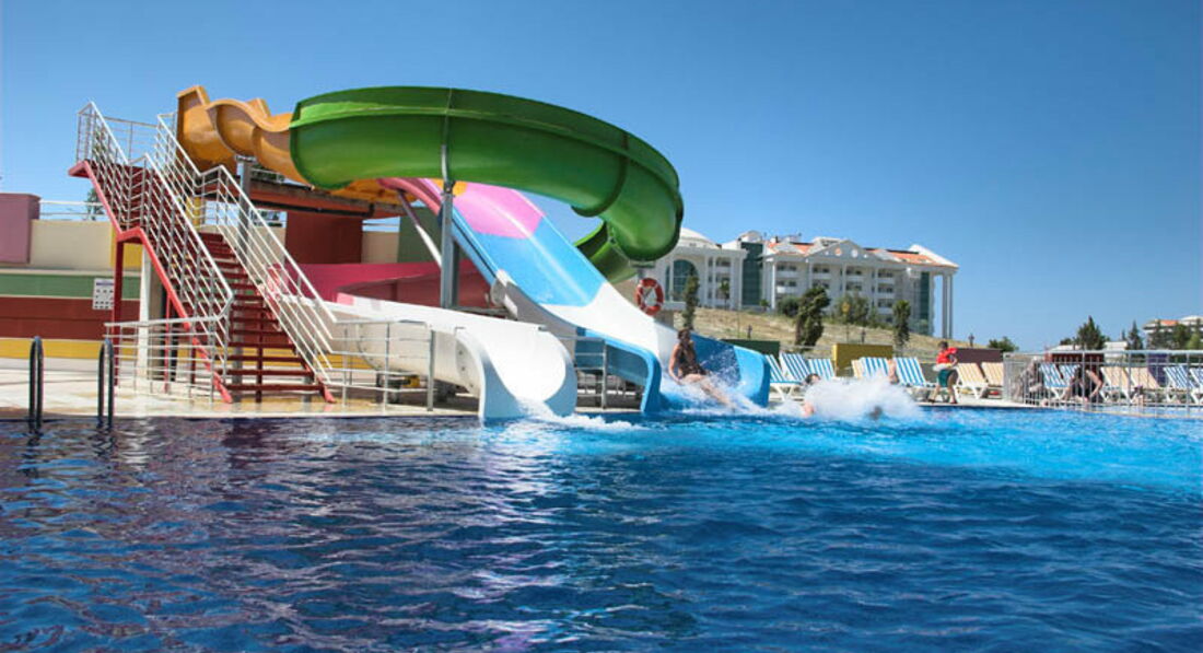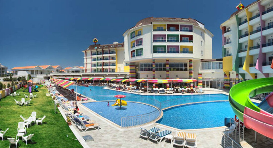 Отдыхали вдвоем с ребенком 8 лет в первой половине мая.Отель чистый ( если не придираться совсем),питание нормальное,но не хватало сильно фруктов( (были только яблоки,апельсины) один раз была клубника за 10 дней и пару раз грейпфрут ,за это и не ставлю 5.Самый большой минус - анимация.Днем ее нет совсем.Вечером очень тухлая.когда мы прилетели отель был заполнен на 80 процентов русскими.10 процентов семьи турок или курдов.там не поймёшь,оставшиеся десять процентов - Европа .Но спустя десять дней русских поубавилось- прилетела Европа( немцы и англичане) их очень много стало..так что в конце мая фифти- фифти-( ну и конечно же пару тройку больших семей турокЯ это к тому,что из русскоговорящего персонала,только на рецепшене Ольга.Русских много,а по русски мало кто понимает( только в барах название алкогольных напитков) По немецки несколько турок разговаривают свободно...В целом неплохой отель,но туда больше ехать не хочется..Пляж песок,на заход в море - галька ( одна женщина сильно разрезала ногу и ей зашивали)Горки работали 2 раза в день по часу.(для ребенка мало) В отеле есть крытый бассейн.мы там спасались в дурное солнце..