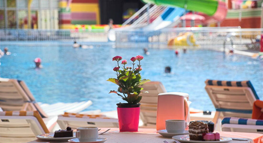 Бассейн чистый. С местами проблем нет. Горки работают с 11 до 12 и с 15 до 16.