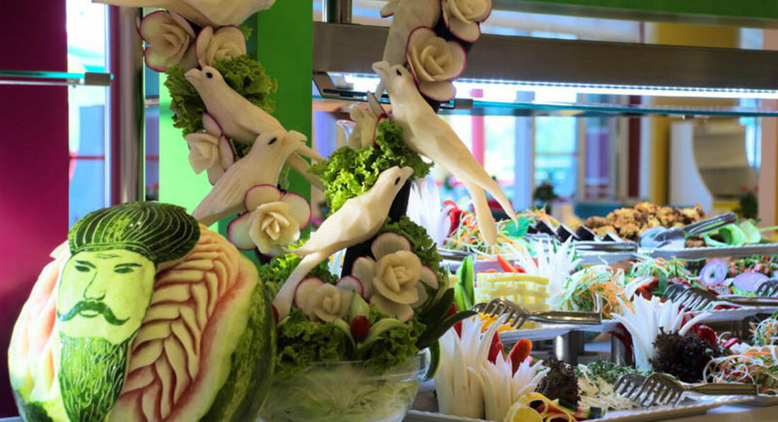 Так как ездили с детьми (самому маленькому чуть более 2 лет) брали с собой пол чемодана лекарств и детское питание на всякий случай. Слава богу ничего не пригодилось. Хоть и детского стола в отеле не было можно в принципе было что-то найти покушать, Но предварительно попробовав самому. Утром всегда была молочная кашка, не то пшенично овсяная, не то пшенично-перловая, но сладкая. Очень вкусный хлеб и булочки. Всегда на пару либо брокколи, либо цветная капуста, тушеная картошка с овощами. В принципе этим ребенка и кормили. С пирамидами на тарелках не экспериментировали. Брали по минимуму, пробовали, потом брали что понравилось. Возможно поэтому проблем с желудком не было. Никогда не было чтобы чего-то не хватило (кроме персиков, которые в карманы рассовывались за 30 сек), мяса или чего-то еще. Немного ждали и повара приносили новую порцию. Официанты всегда ворчали и кивали головой убирая с соседних столов тарелки с горами оставшихся продуктов.